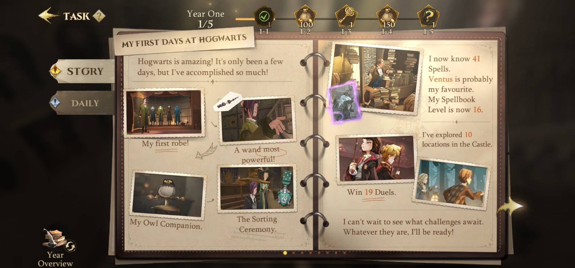 สำหรับโหมดภารกิจ Story เป็นส่วนของโหมดเนื้อเรื่องจะมีภารกิจที่หลากหลายให้เราออกผจญภัยในดินแดนแห่งเวทมนตร์ตามฉบับ Harry Potter ขนานแท้ ไม่ว่าจะไปพบเพื่อนใหม่ ๆ หรือทำภารกิจกับศาสตราจารย์มักกอนนากัล ก็มีเนื้อเรื่องให้เสพแบบครบรส ยิ่งใครเป็นแฟนแฮรี่มาก่อนอาจโดนตกได้ไม่ยาก ด้วยความที่อิงเนื้อเรื่องเทียบเคียงต้นฉบับ ก็จะทำให้ทุกคนมีโอกาสใกล้ชิดกับตัวละครสุดโปรดได้ง่าย ๆ อาทิ เฮอร์ไมโอนี่ เกรนเจอร์, แฮร์รี่ พอตเตอร์, รอนนัลด์ วิสลีย์, อัลบัส ดัมเบอร์ดอร์, เดรโก มัลฟอย และเซเวอรัส สเนปเป็นต้น