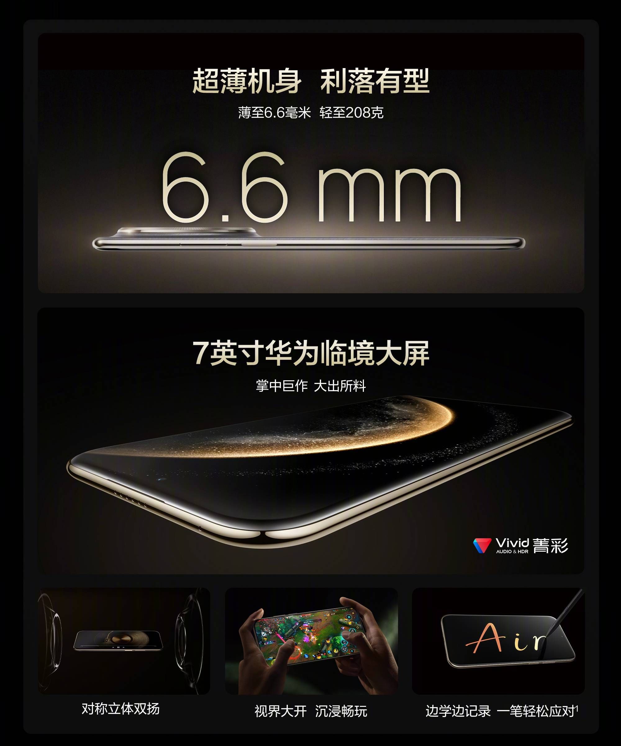 ถึงแม้จะบางไม่เท่าคนอื่น แต่ HUAWEI Mate 70 Air ดูเหมือนว่าจะทำออกมาเพื่อเป็นคู่แข่งของ iPhone Air โดยเฉพาะ ด้วยความบางตัวเครื่อง 6.6 มม. (iPhone Air บาง 5.6 มม.) แต่มาพร้อมฟีเจอร์ที่ครบเครื่อง และจัดจ้านกว่าพอสมควร