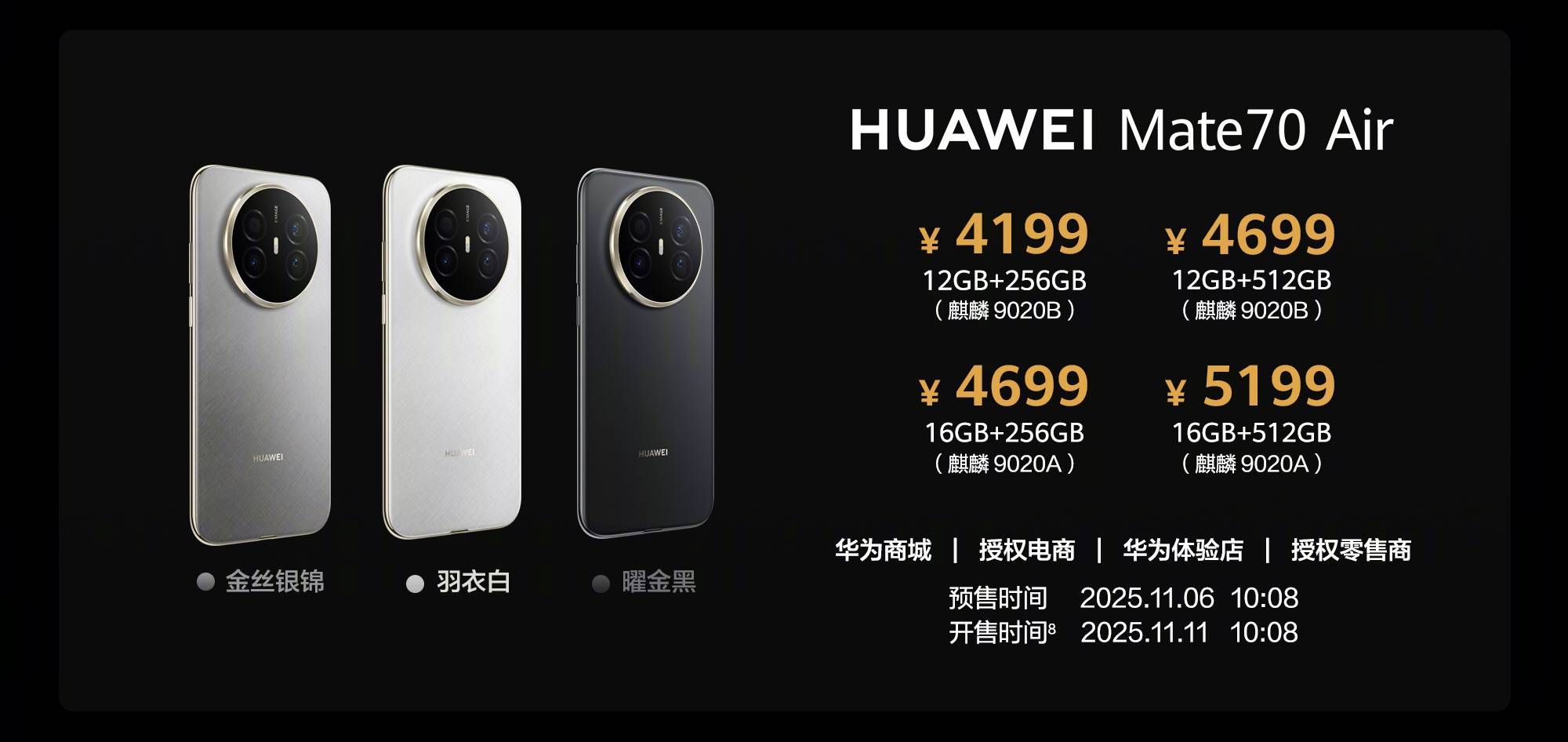HUAWEI Mate 70 Air เปิดตัวในประเทศจีนด้วยกันทั้งหมด 3 สี ได้แก่ สีดำ (Obsidian Black) สีขาว (Feather White) และสีเงิน (Silver Brocade) พร้อมกับตัวเลือกรุ่นความจุทั้งหมด 4 แบบ ดังนี้