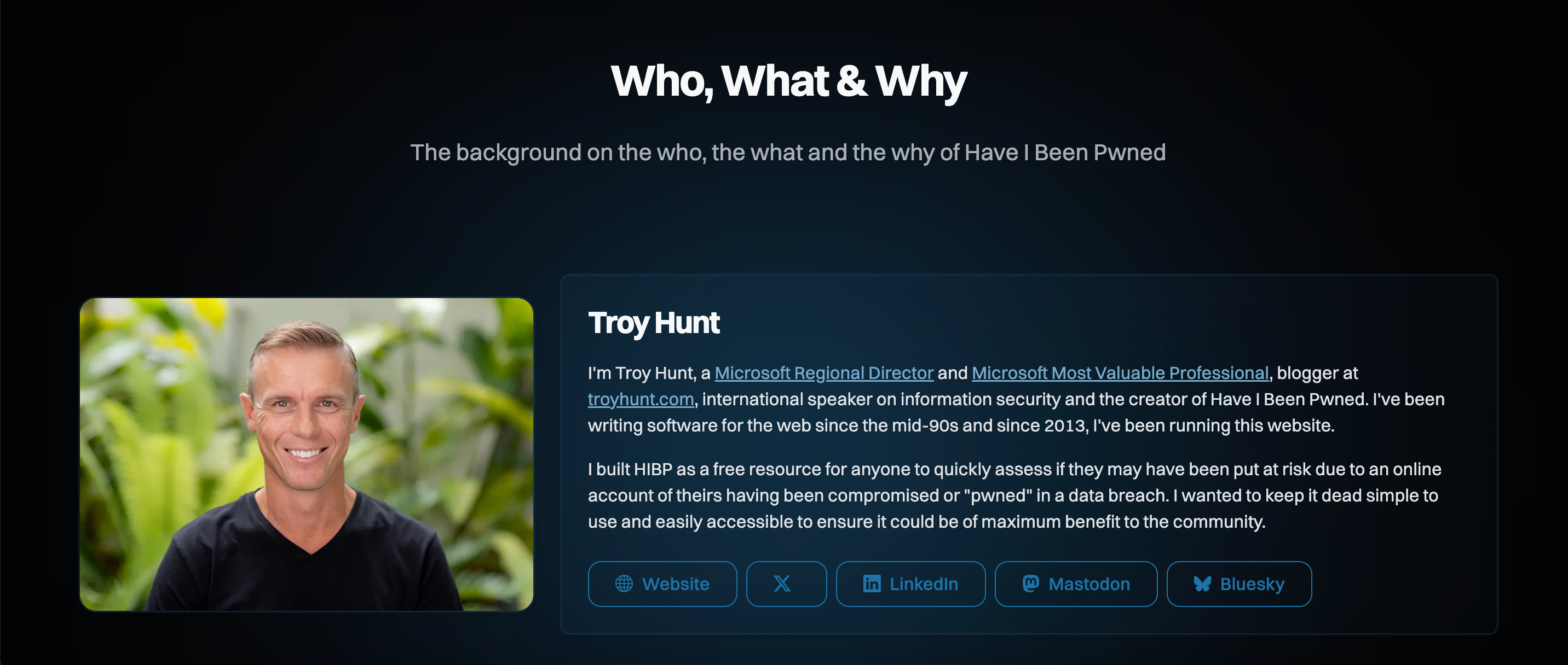 สำหรับผู้ที่ก่อตั้ง และดำเนินเว็บไซต์นี้มาตั้งแต่ปี 2013 ก็คือ Troy Hunt ผู้เชี่ยวชาญด้านความปลอดภัย ที่ได้รับตำแหน่ง Regional Director และ Microsoft Most Valuable Professional (MVP) สาขา Developer Security จากทาง Microsoft
