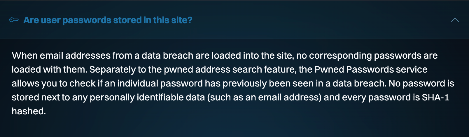 ตัวเว็บไซต์จะใช้การเข้ารหัสแบบ SHA-1 โดยข้อมูลที่เรากรอกไปจะถูกเปลี่ยนเป็นชุดข้อมูลแบบสุ่ม (SHA-1 Hash) ตัวเว็บไซต์ Have I Been Pwned จะเห็นตัวอักษรหรือตัวเลขจากชุดข้อมูลนั้น ๆ เพียงแค่ 5 ตัวอักษรแรก จากนั้นเบราว์เซอร์หรืออุปกรณ์ของเราจะทำการประมวลผล On-device แล้วนำไปเทียบกับชุดข้อมูลบนเว็บที่ได้รับมาจากหน่วยงานหรือ Database อีกทีหนึ่งว่ามีปรากฏอยู่ในรายชื่อของข้อมูลที่เคยรั่วไหลหรือเปล่า