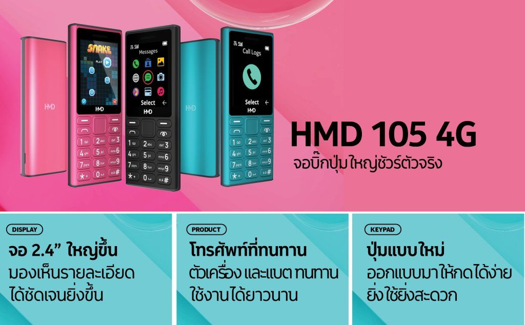 HMD ประเทศไทยเปิดตัว HMD 105 4G มือถือปุ่มกด 4G ที่มาพร้อมมาตรฐานยุโรป และฟีเจอร์ให้ใช้งานแบบครบครัน แบตเตอรี่อึด พกพาสะดวก ใช้งานได้ยาวนาน ในราคาเพียง 990 บาท !
