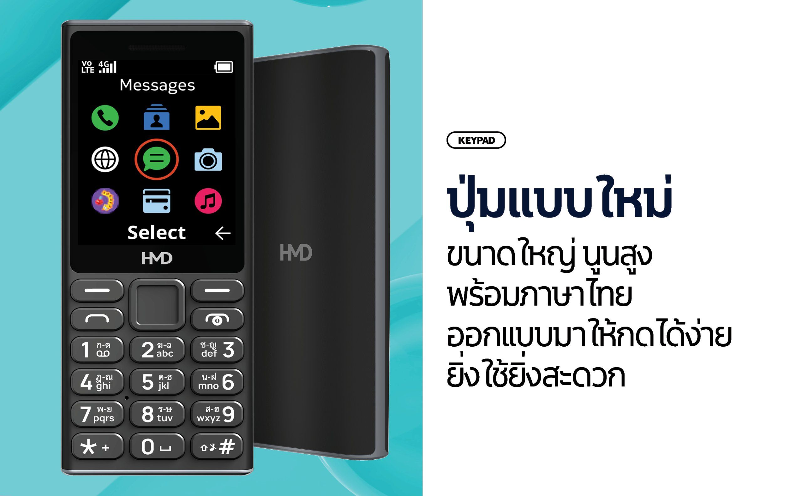HMD 105 4G มาพร้อมจอแสดงผล QVGA ขนาด 2.4 นิ้ว พร้อมปุ่มกดรองรับภาษาไทย ขนาดใหญ่เห็นชัดเจนกดง่ายใช้งานสะดวก พร้อมกับตัวเลือกสีทั้ง 3 สี
