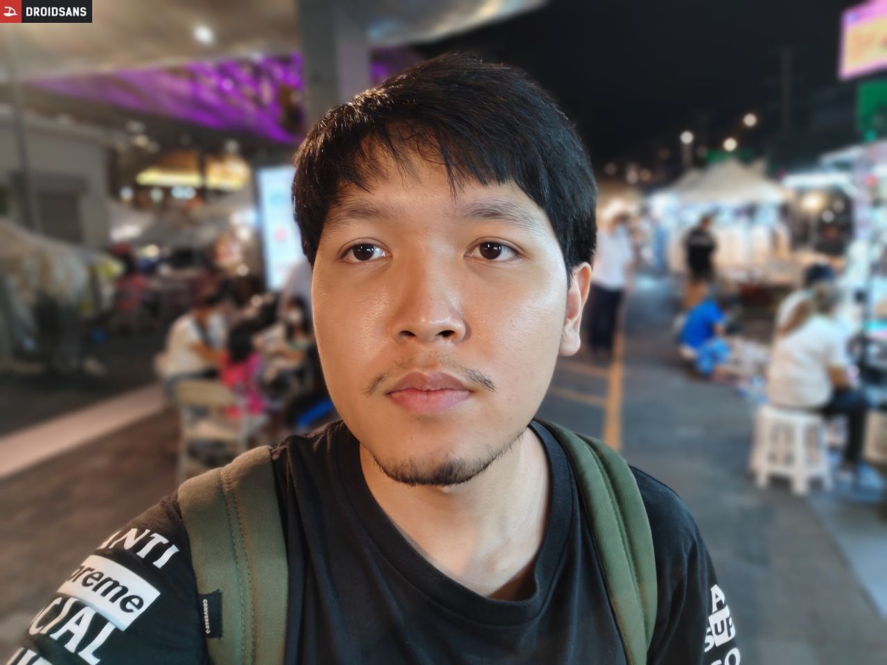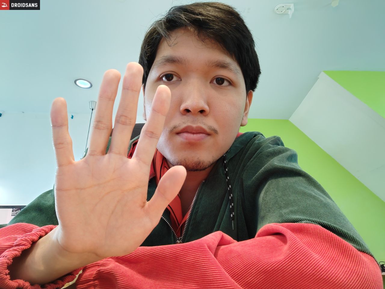 กล้องหน้า 32MP ให้มาเพียงพอ ถ่ายแล้วหน้าชัด แต่ยังมีการปรับให้ผิวเนียนอยู่บ้างแม้ปิด Beauty มาพร้อมกับฟีเจอร์ถ่ายกล้องหน้าด้วยการโชว์ฝ่ามือ หากเลือกเปิดโบเก้โชว์ภาพพื้นหลังเบลอก็มีการตัดขอบเรียบร้อยดี ไม่มีขอบฟุ้งหรือตัดขอบผิด
