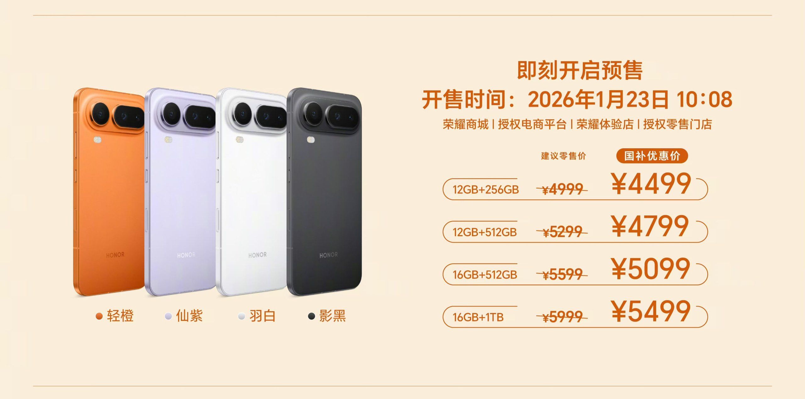 HONOR Magic8 Pro Air เปิดตัวในจีนด้วยกันทั้งหมด 4 สี ได้แก่ สีส้ม (Soft Orange), สีม่วง (Fairy Purple), สีขาว (Feather White), และสีดำ (Phantom Black) ราคาเริ่มต้น 4,999 หยวน