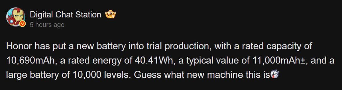 ล่าสุด Digital Chat Station จอมแม่นขาประจำออกมาเปิดเผยว่า HONOR กำลังทดสอบแบตเตอรี่ 11,000mAh ที่จะนำมาใช้กับมือถือรุ่นใหม่ของตนเองในอนาคต แต่ยังไม่มีกรอบเวลาหลุดออกมาว่าจะได้เปิดตัวเมื่อไหร่