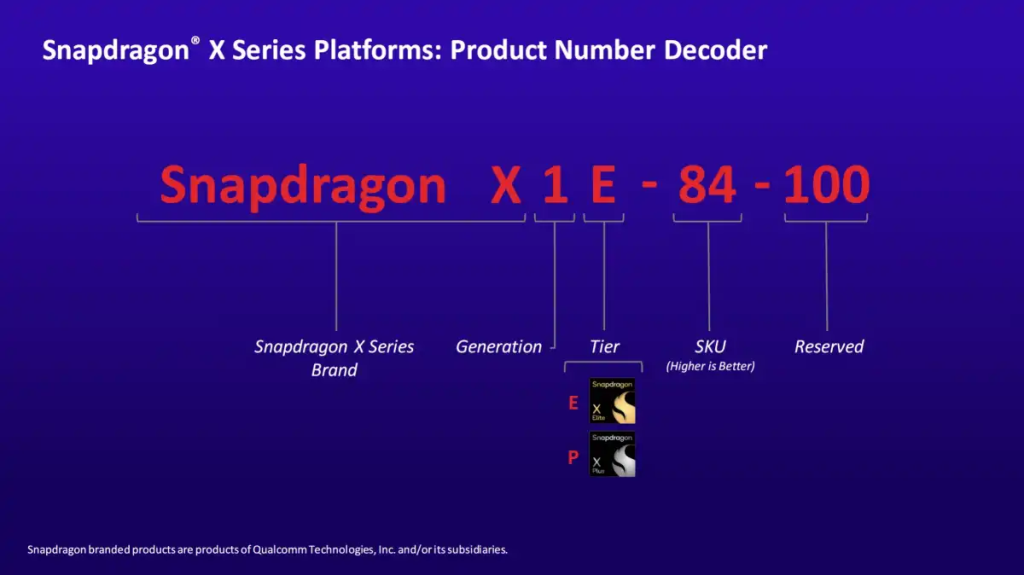 ฝั่ง Qualcomm ถือว่าเป็นค่ายที่ตั้งชื่อรุ่นเข้าใจง่ายที่สุดในบรรดาซีพียูโน้ตบุ๊กยุคนี้ เพราะไม่ได้มีรหัสซับซ้อนยาว ๆ แบบฝั่ง Intel หรือ AMD โดยหลัก ๆ ในปัจจุบันจะแบ่งออกเป็น 3 ระดับหลัก
