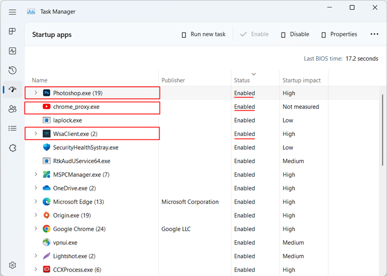 ㅤ - หลังวางเสร็จ พอไปเปิดดูในหน้า Startup ของ Task Manager หรือหน้า Settings > Apps > Startup ก็จะพบว่ามีชื่อของโปรแกรมที่เราเพิ่งวางไปโผล่มาแล้ว ในตัวอย่างก็คือ Photoshop.exe, chrome_proxy.exe (ของ Gmail) และ WsaClient.exe (ของ Play Store) โดยมีสถานะเป็น Enabled คือเปิดให้ใช้งานเรียบร้อย (หากยังไม่เป็นก็ตั้งให้เป็น Enabled เองเลย)