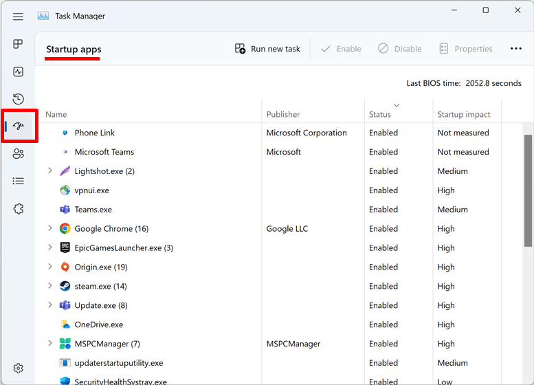 ㅤ - ที่หน้า Task Manager คลิกที่แท็บเมนู Startup โดยของ Windows 11 จะอยู่ตรงแถบฝั่งซ้ายเป็นไอคอนรูปเข็มนาฬิกา มีชื่อเต็มว่า Startup apps ส่วนของ Windows 10 (และ 11 เวอร์ชันเก่า) จะเป็นแถบด้านบนเขียนว่า Startup เลย