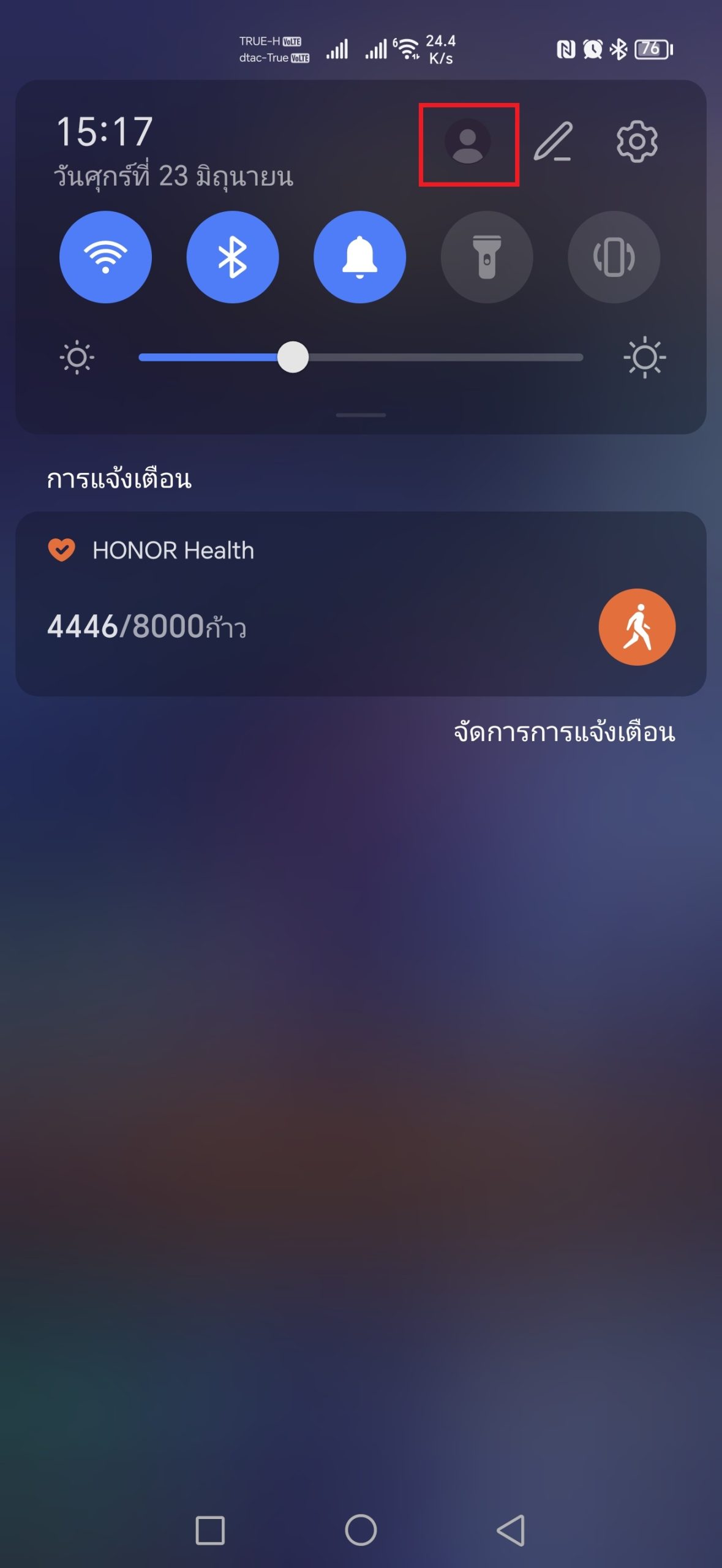 มือถือค่าย HONOR ก็ง่าย ๆ แค่รูดแถบด้านบนลงมาครั้งเดียวก็จะเจอกับไอค่อนสลับบัญชีเลย ก็ให้กดไปตรงไอค่อนนั้นแล้วเลือก ผู้เข้าร่วม (Guest) ก็เรียบร้อย เวลาจะสลับกลับไปบัญชีเจ้าของก็ทำแบบเดิม