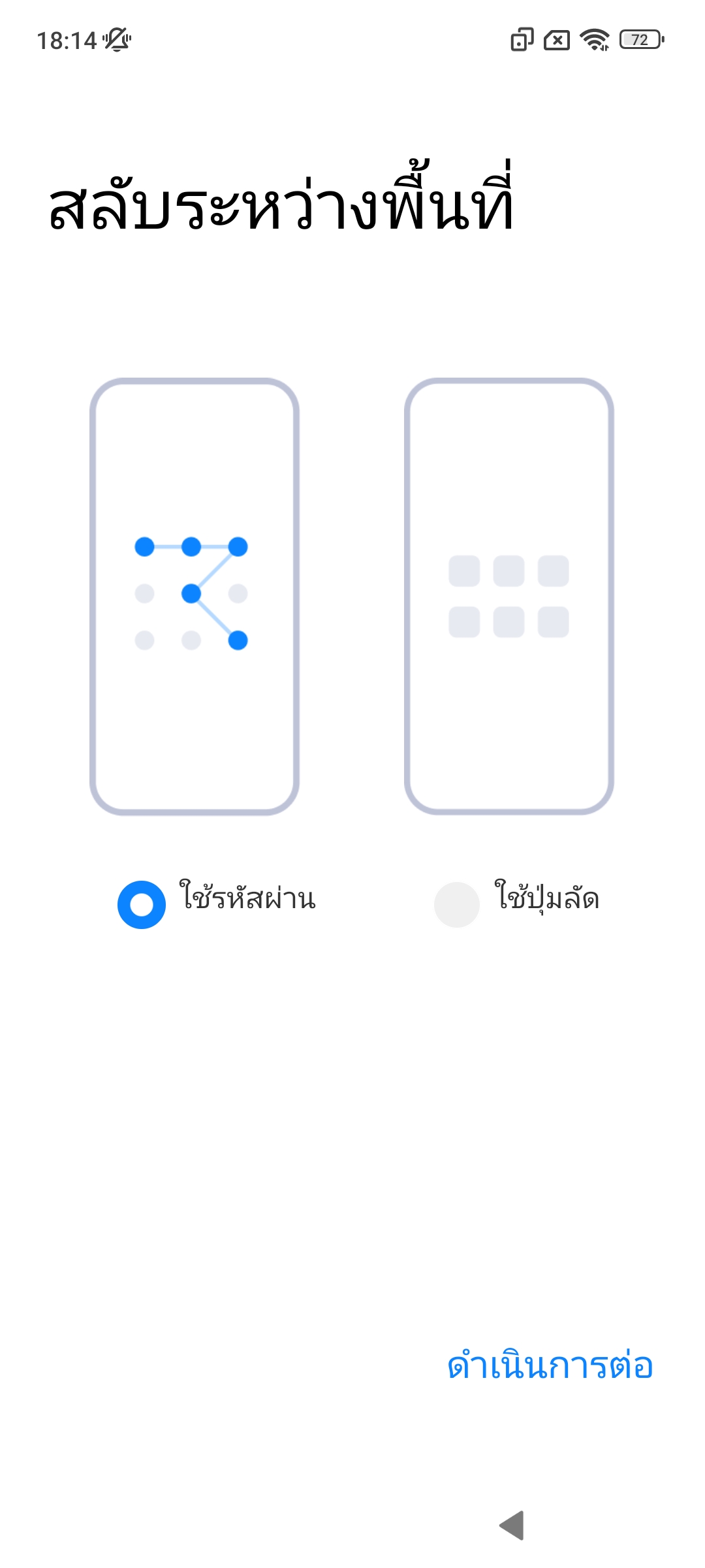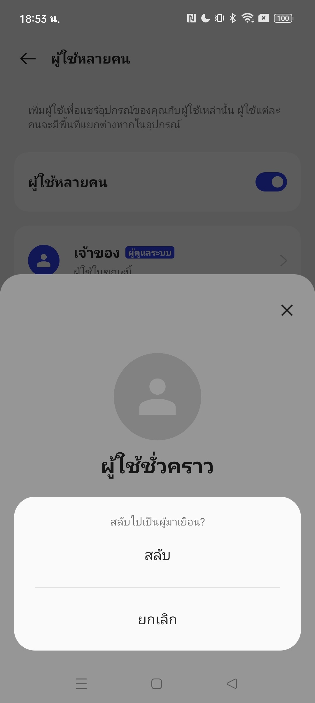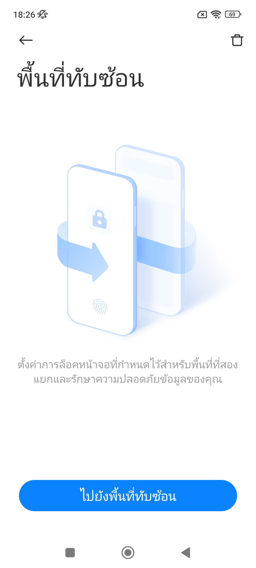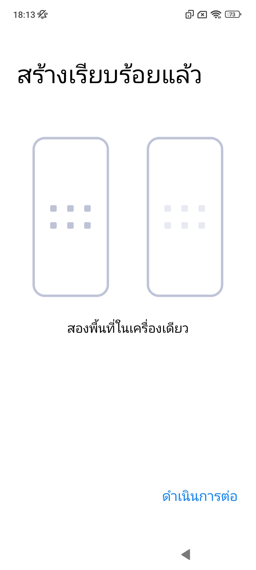 พอเราสร้าง Second space เรียบร้อยแล้ว จะมีไอค่อน “สลับ” ขึ้นมาสำหรับกดสลับกลับไปที่บัญชีเจ้าของเครื่อง ส่วนบัญชีเจ้าของเครื่องหากต้องการกลับเข้าไปที่บัญชี Second space ก็ให้ใส่รหัสปลดล็อคหน้าจอที่ตั้งแยกไว้เพื่อเข้าใช้บัญชีนั้นได้เลย