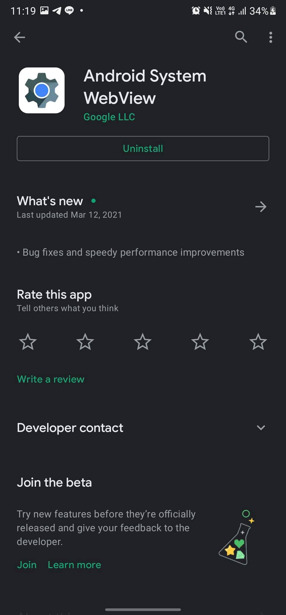 หรือจะเข้าไปในแอป Google Play Store แล้วหา Android System WebView ด้วยตัวเองก็ได้ จากนั้นจิ้ม Uninstall เพื่อย้อนกลับไปเวอร์ชันเก่าได้ทันที หลังจากนั้นให้ปิดและเปิดเครื่องใหม่หนึ่งครั้งเป็นอันเรียบร้อยครับ