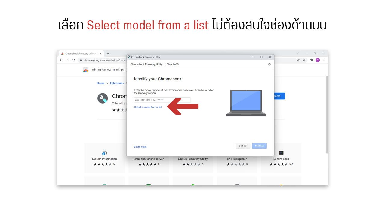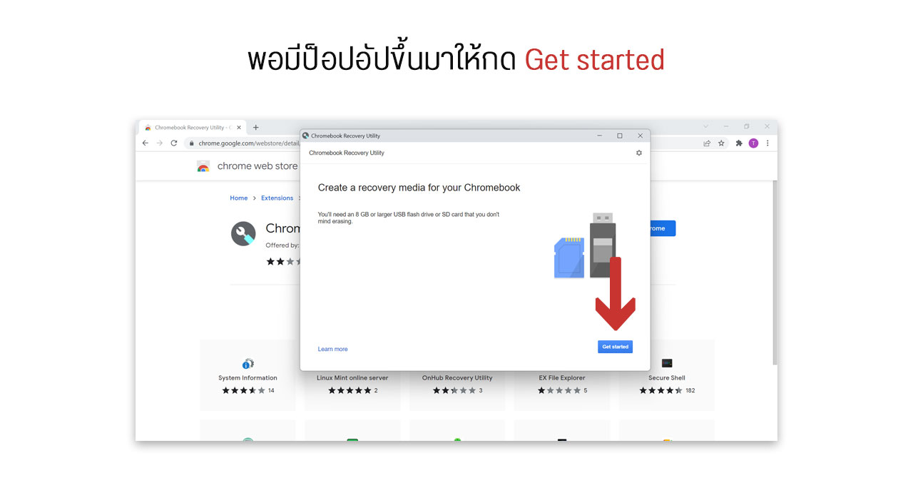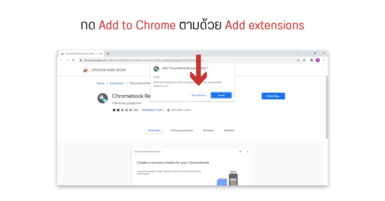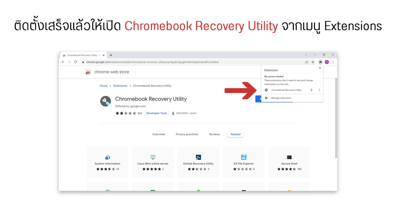 - ติดตั้งส่วนขยาย Chromebook Recovery Utility ในเบราว์เซอร์ Chrome เสร็จแล้วให้คลิกซ้ายที่ส่วนขยายเพื่อเปิดป็อปอัปขึ้นมา