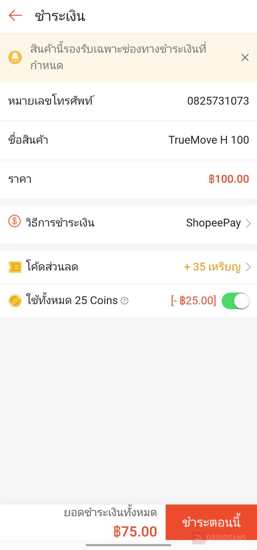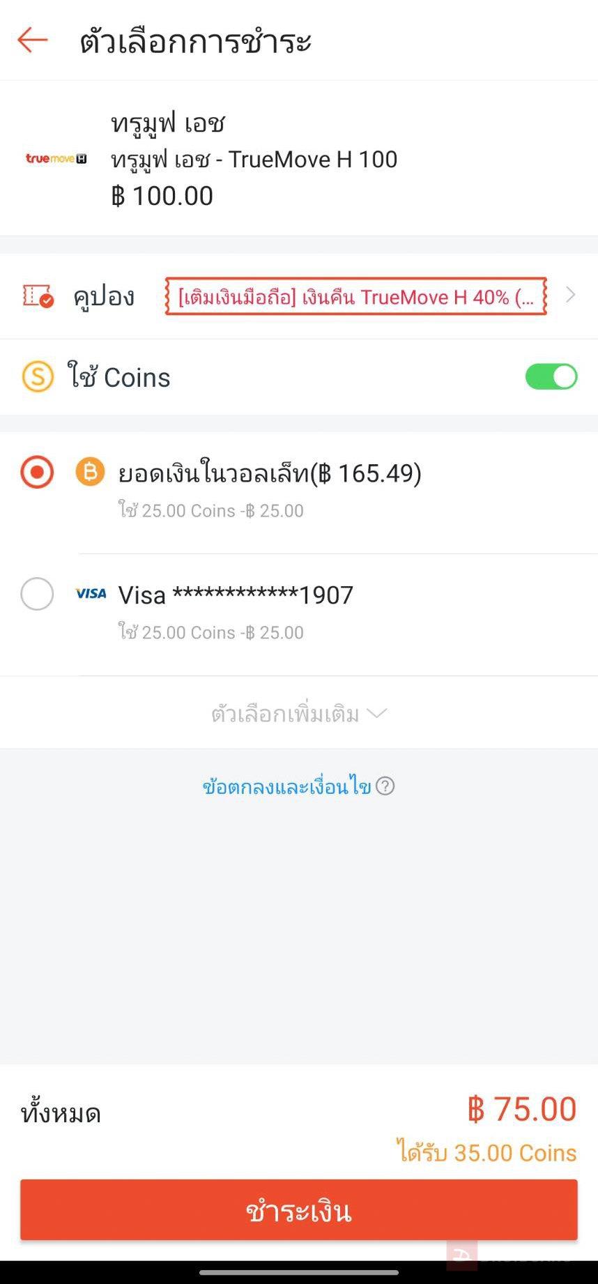 **จากในรูป คือ ทีมงานเติมเงิน 100 บาท ใช้ Coin ลด 25 บาท เท่ากับต้องจ่ายจริง 75 บาท และได้ Coin อีก 35 เหรียญ ไว้ใช้ในส่วนลดครั้งถัดไป