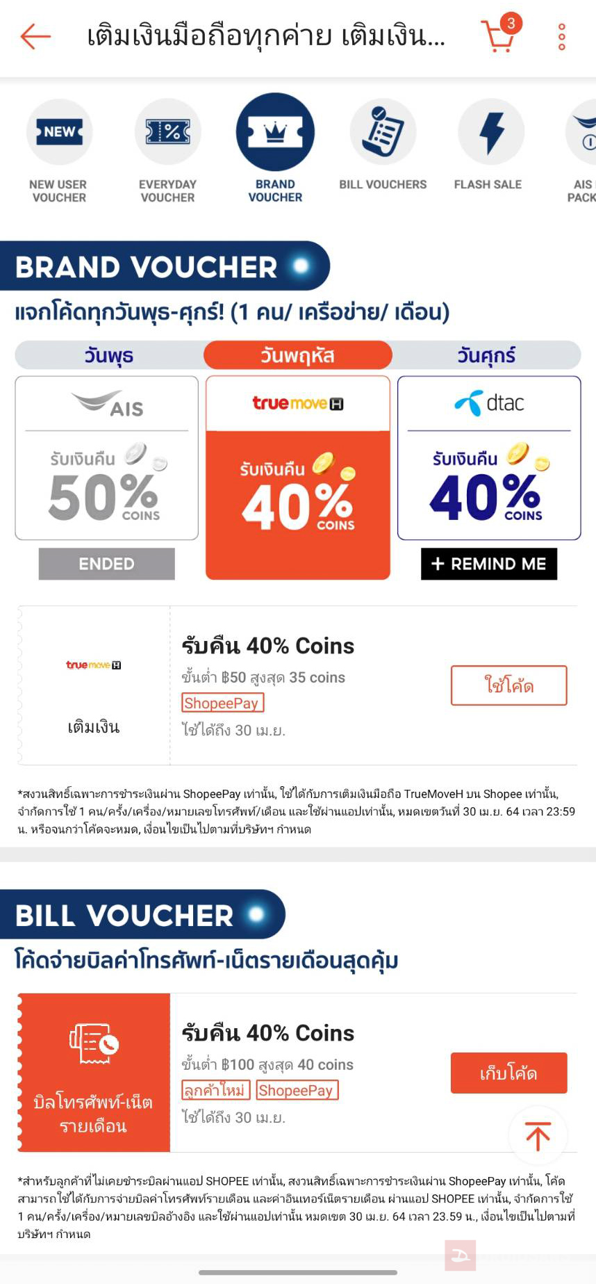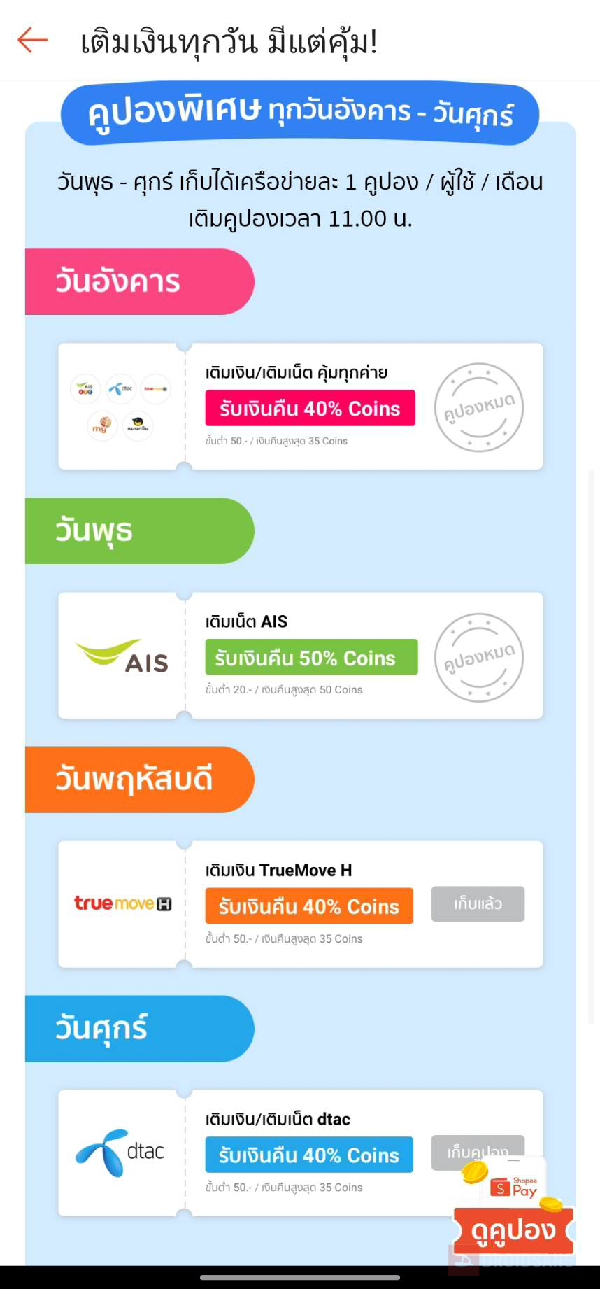 - วันพุธ : เติมเงิน AIS ได้โค้ด Coin เป็นส่วนลดมากเป็นพิเศษ