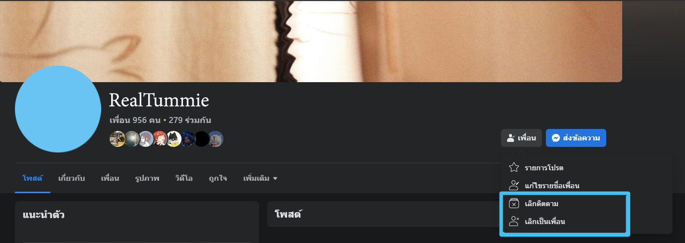 - ไปที่หน้า Profile ของเพื่อน > เลือกปุ่มเมนูเพื่อน > เลือกเลิกเป็นเพื่อน หรือเลิอกติดตามได้พร้อมกันค่ะ