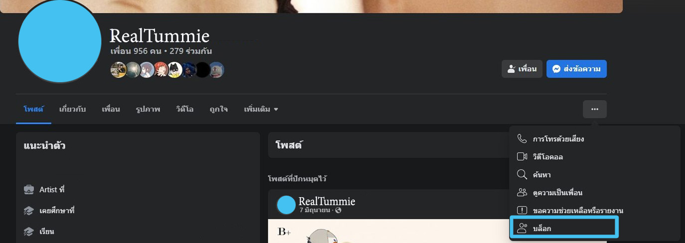 - ต่อมาเป็นการ บล็อกบุคคล > ไปที่จุดสามจุดข้างล่างคำว่าเพื่อน > เลือก บล็อค : แค่นี้เราก็จะไม่เห็นข้อความหรือโพสที่ไม่เหมาะสมจากบุคคลนั้นอีกตลอดไปค่ะ จนกว่าเราจะเลิกบล็อคเองเพื่อปกป้องตัวเราไปในตัวด้วยถ้ามีใครมาโจมตีทั้ง ๆ ที่เราไม่ได้ผิดอะไร หรืออีกอย่างคือการปิดกั้นข้อมูลเป็นเท็จและ อันตรายจากบุคคลเหล่านั้น