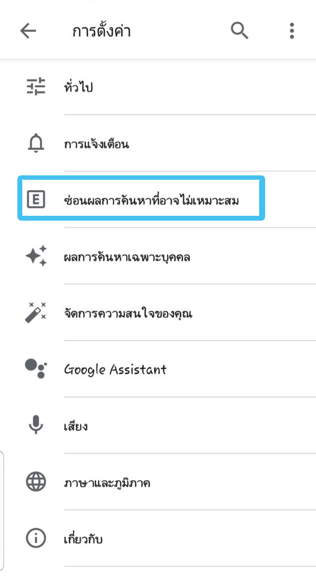 - ในการกรองเนื้อหาไปที่หน้าบัญชีของเรา > การตั้งค่า > ซ่อนผลการค้นหาที่ไม่เหมาะสม > กดเปิด ตัวกรองผลการค้นหาที่ไม่เหมาะสม : การเปิดฟีเจอร์ค้นหาปลอดภัยจะช่วยซ่อนเนื้อหาที่ไม่เหมาะสม เช่น ภาพลามกอนาจาร หรือเนื้อหารุนแรง