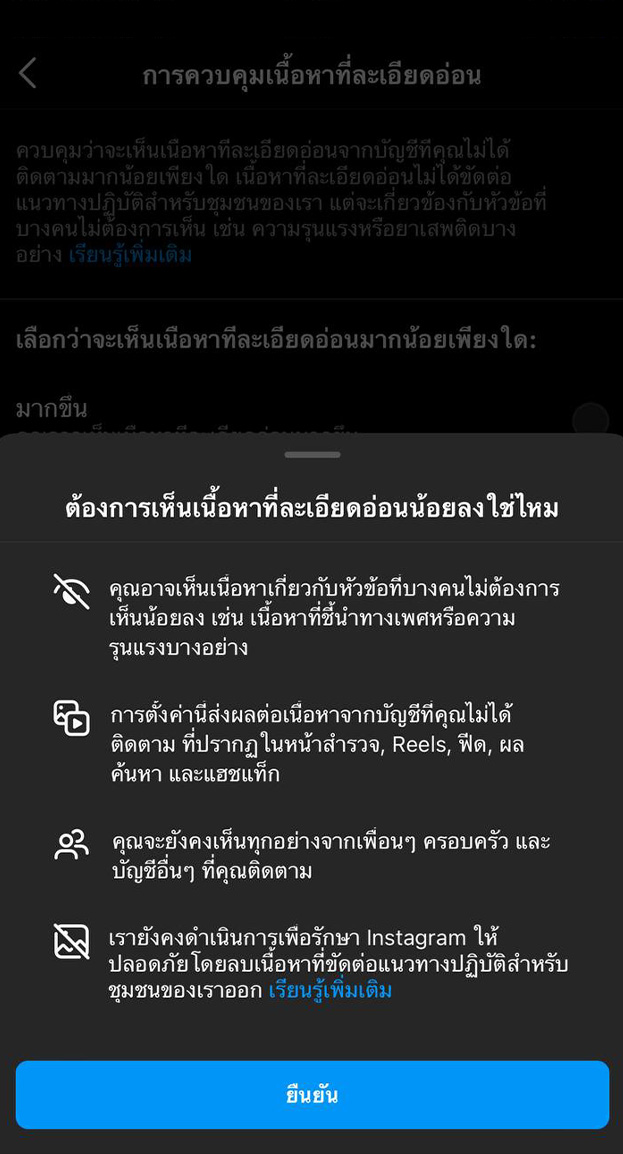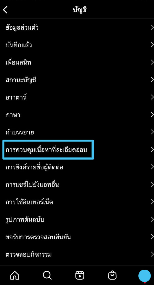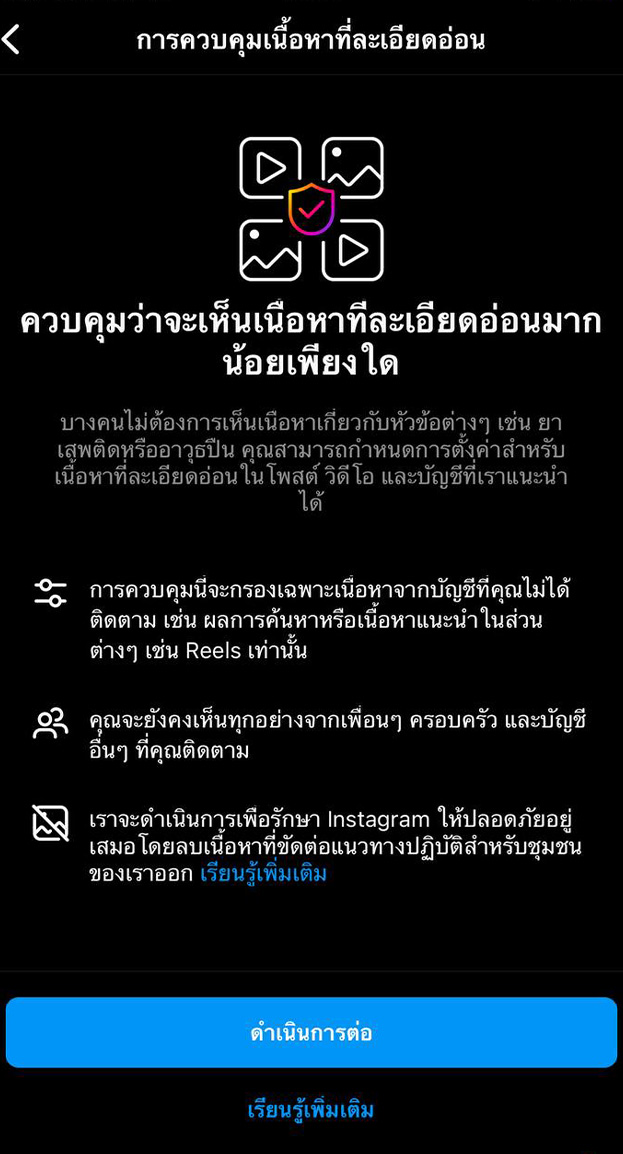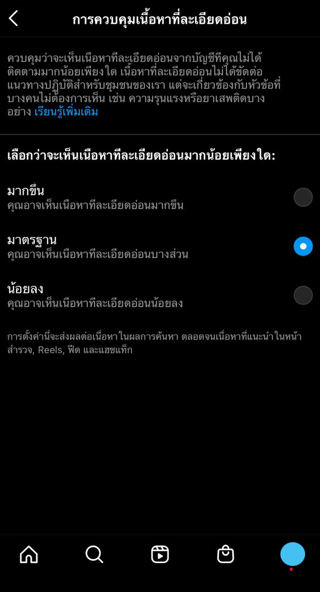 - ในการกรองเนื้อหาไปที่แอค instagram > เลือกปุ่มเมนูมาที่หน้าบัญชีของเรา > การตั้งค่า > เลือกบัญชี > เลื่อนลงมาที่การควบคุมเนื้อหาที่ละเอียดอ่อน > ซึ่งค่าตั้งต้นจะเลือกให้เราเป็นมาตรฐาน > ให้เรากดเลือกน้อยลง : เพื่อให้เนื้อหาแสดงสื่อที่มีความล่อแหลมได้น้อยลงไปนั่นเองค่ะ