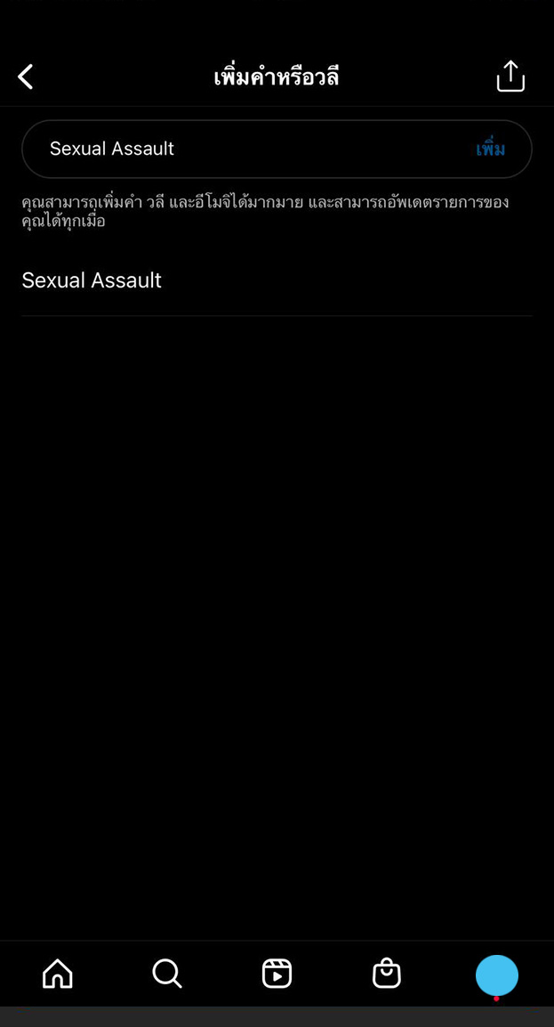 - ในการกรองเนื้อหาคำหรือวลีไปที่แอค instagram > เลือกปุ่มเมนูมาที่หน้าบัญชีของเรา > การตั้งค่า > เลือกความเป็นส่วนตัว > เลื่อนลงมาที่คำที่ซ่อนไว้ > จัดการคำและวลีที่กำหนดเอง > เพิ่มคำหรือวลีอย่าง ”Sexual Assault” เป็นที่เรียบร้อย แค่นี้ทาง instagram จะทำการคัดกรองเนื้อหาทุกอย่างรวมไปถึงข่าวสารรูปภาพ หรือวิดีโอสั้นบนฟีดโดยรวมค่ะ