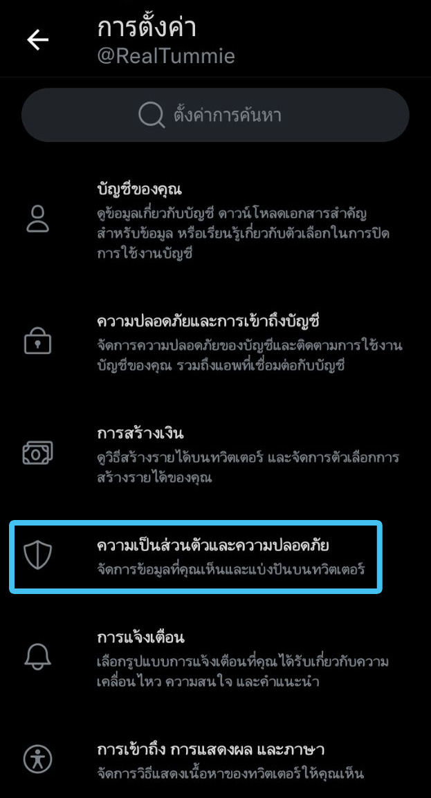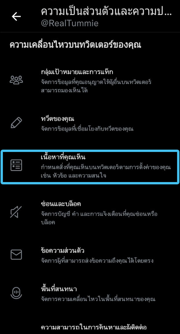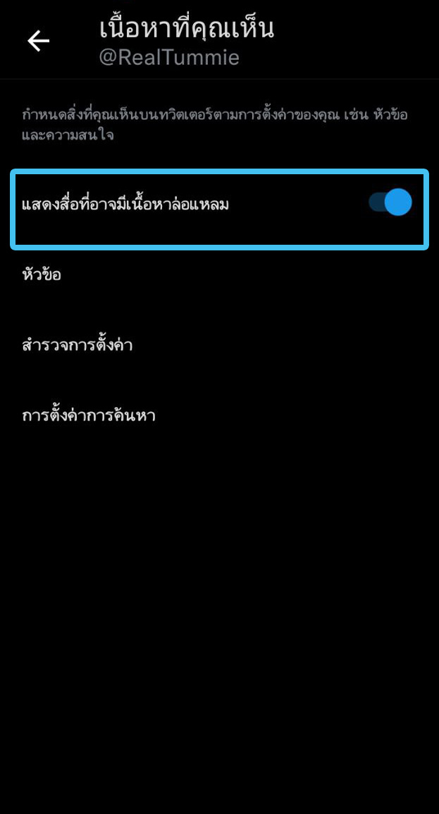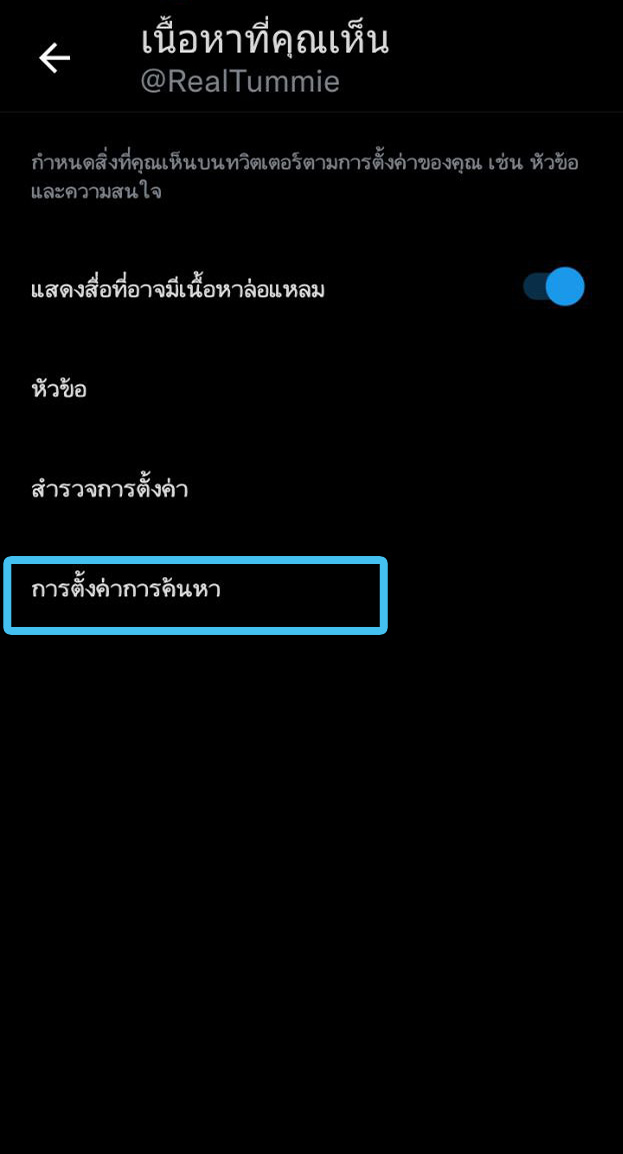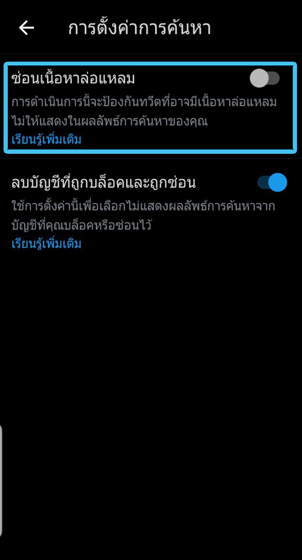 - ในการกรองเนื้อหาไปที่แอค Twitter > เลือกปุ่มเมนูมาที่หน้าบัญชีของเรา > การตั้งค่าและความเป็นส่วนตัว > ความเป็นส่วนตัวและความปลอดภัย > เนื้อหาที่คุณเห็น > เลื่อนลงไปที่ > การตั้งค่าการค้นหา > กดเลือกซ่อนเนื้อหาล่อแหลม