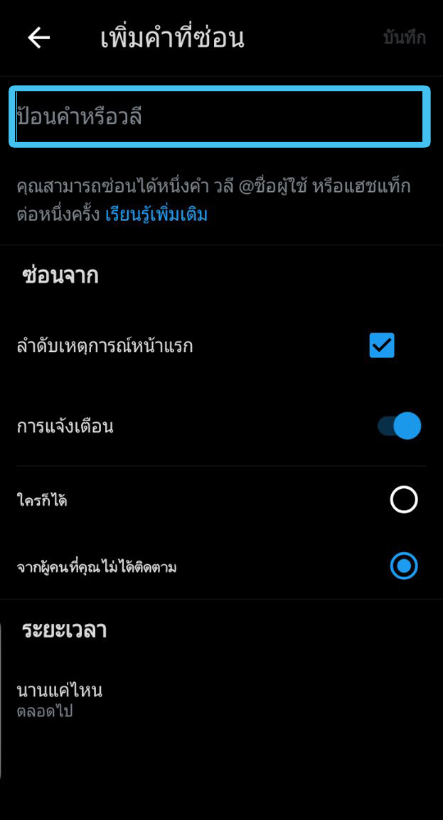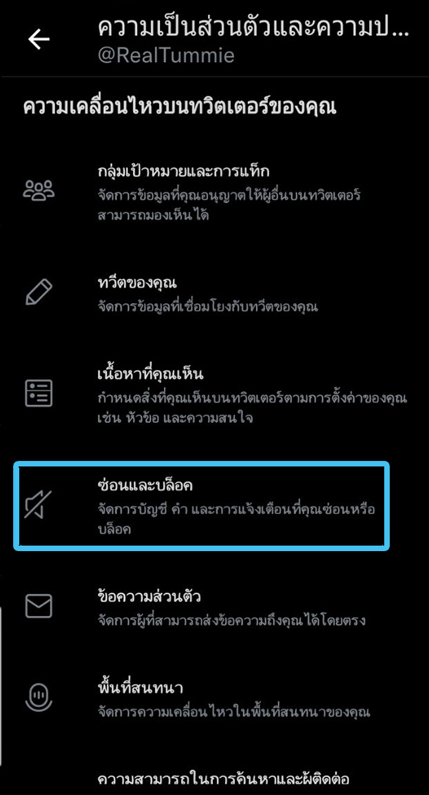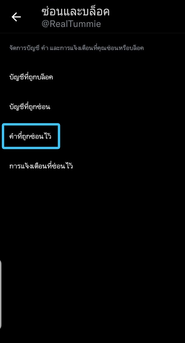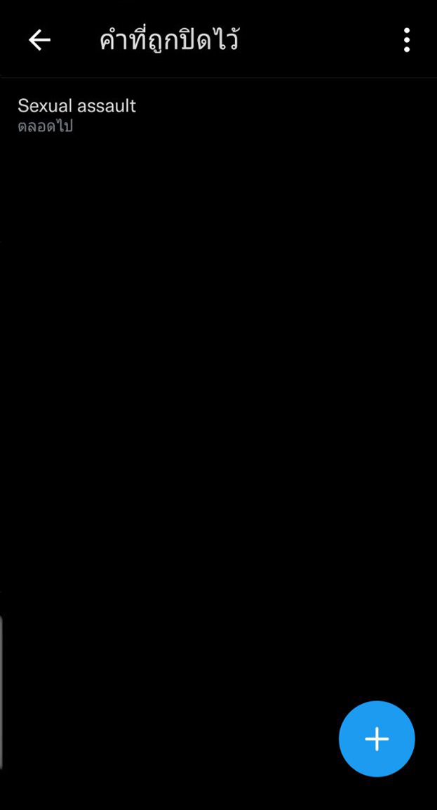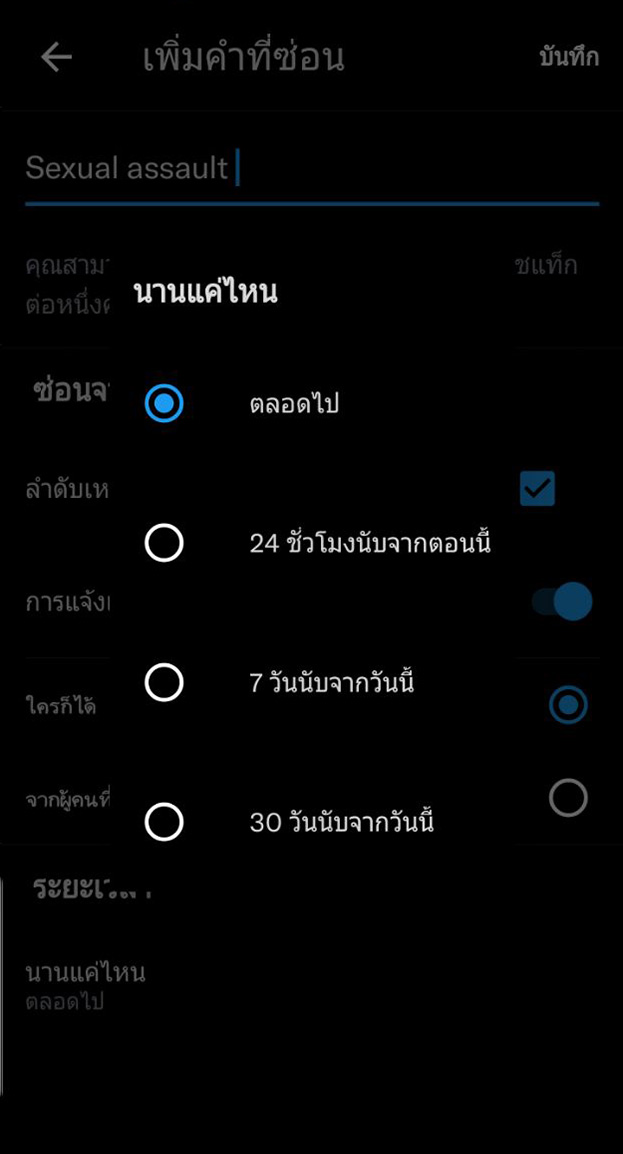 - ในการกรองเนื้อหาไปที่แอค Twitter > เลือกปุ่มเมนูมาที่หน้าบัญชีของเรา > การตั้งค่าและความเป็นส่วนตัว > ความเป็นส่วนตัวและความปลอดภัย > ซ่อนและบล็อค > เลื่อนลงไปที่ > คำที่ถูกซ่อนไว้ > กดเลือก + เพิ่มคำที่ซ่อนไว้ > ให้ป้อนคำหรือวลี Sexual Assault > สามารถเลือก ไทม์ไลน์สำหรับระยะเวลาที่คุณต้องการปิดเนื้อหานี้ได้ตามที่เรากำหนด มีตั้งแต่ ตลอดไป , 24 ชม. , 7 วัน , 30 วันเป็นต้น