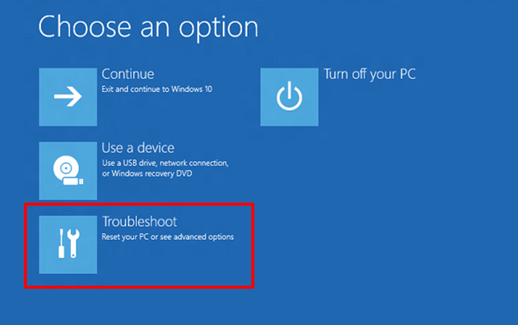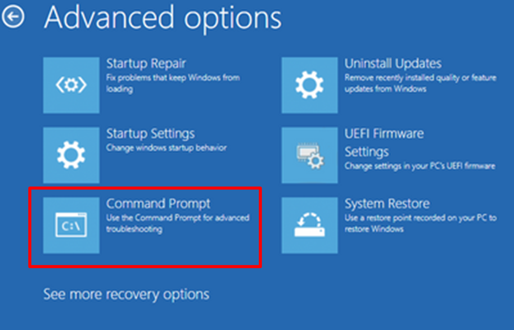 วิธีเปิดให้คอมบูตเข้าโหมด Windows Recovery Environment ก็คือ กดปุ่ม Shift ค้างก่อนกดปุ่ม Restart เครื่อง เมื่อเปิดกลับมาอีกครั้งก็จะเป็นเมนูหน้าสีฟ้า กดเลือก Troubleshoot > Advanced options > Command Prompt (ต่อด้วยกด Skip this drive หากมี)