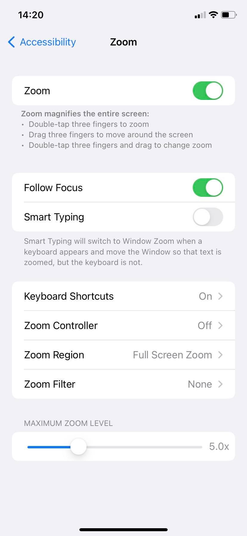 สำหรับฟีเจอร์ Zoom ของ iPhone และ iPad เราสามารถเลือกได้ว่าจะซูมแบบทั้งหน้าจอเลย (Full Screen Zoom) หรือจะเลือกซูมเฉพาะส่วน (Window Zoom) ก็ได้ โดยเข้าไปเลือกได้จากเมนู Zoom Region ครับ