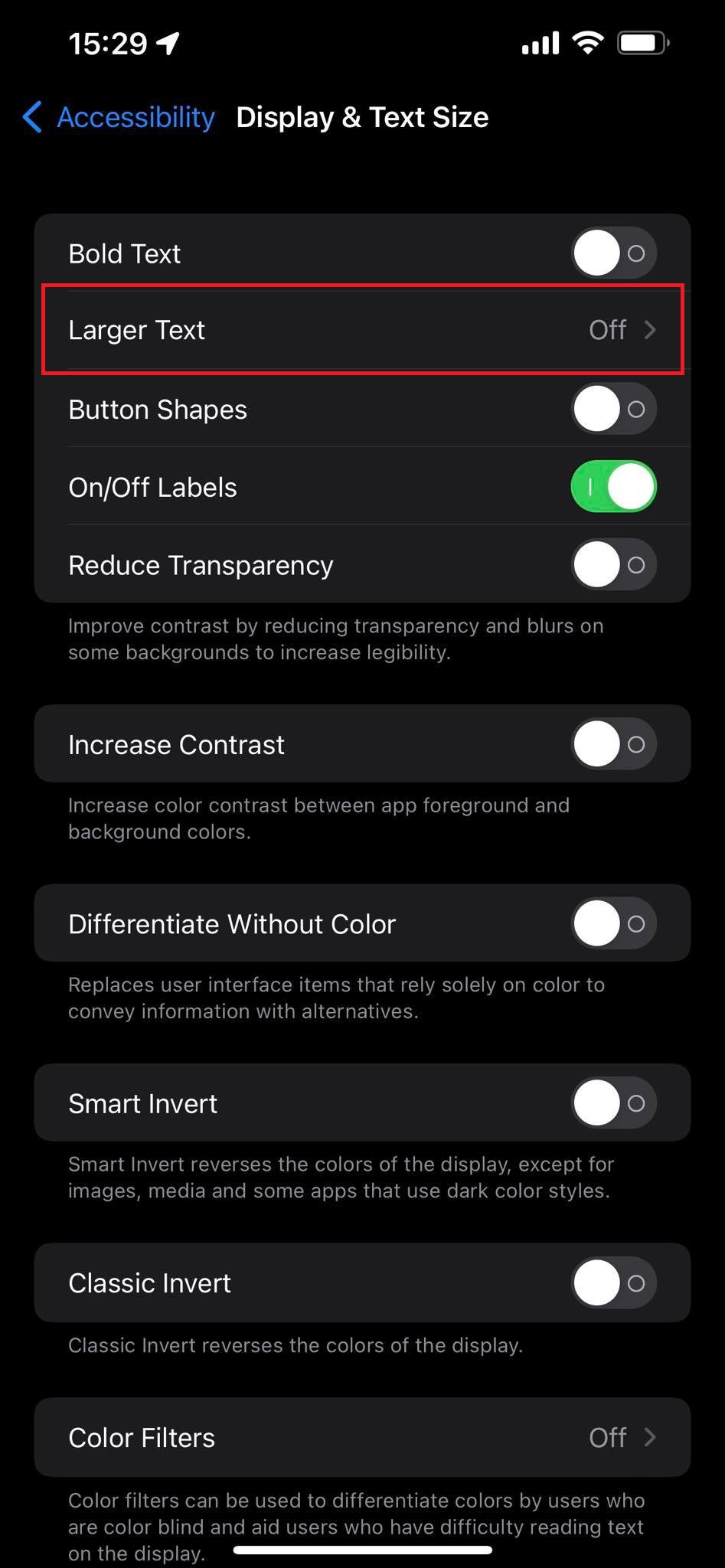 สำหรับการปรับขนาดตัวอักษรของทั้ง iPhone / iPad หรือ iPod Touch ก็ง่ายพอกับมือถือระบบ Android เลย เริ่มจากเข้าไปที่ Settings > Accessibility > เลื่อนหาเมนู Display & Text Size หรือจะพิมพ์ตรงช่องค้นหาในหน้า Settings เอาเลยก็ได้ว่า Text size