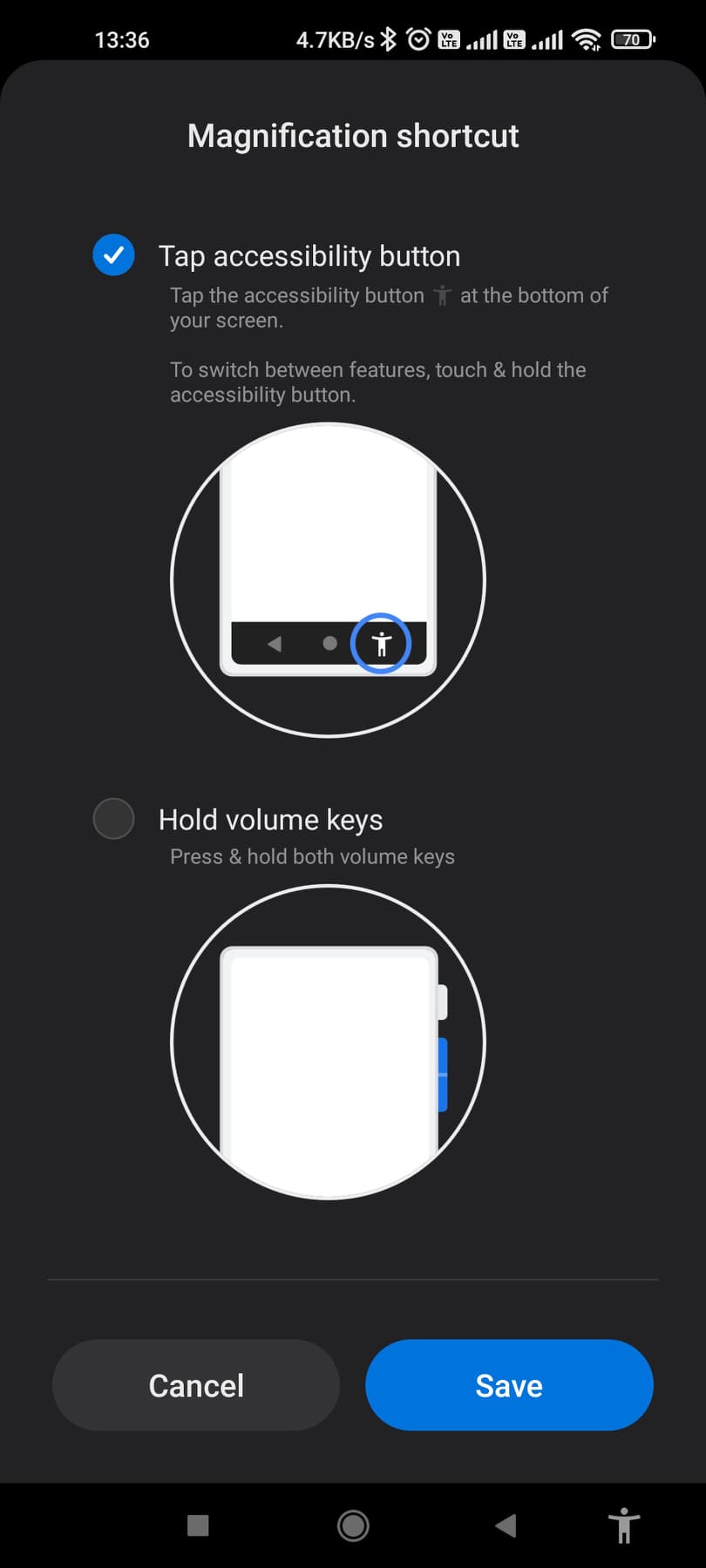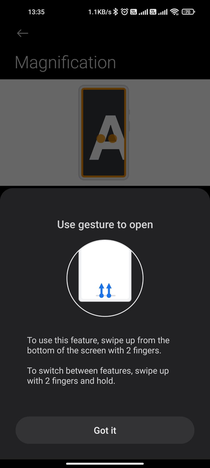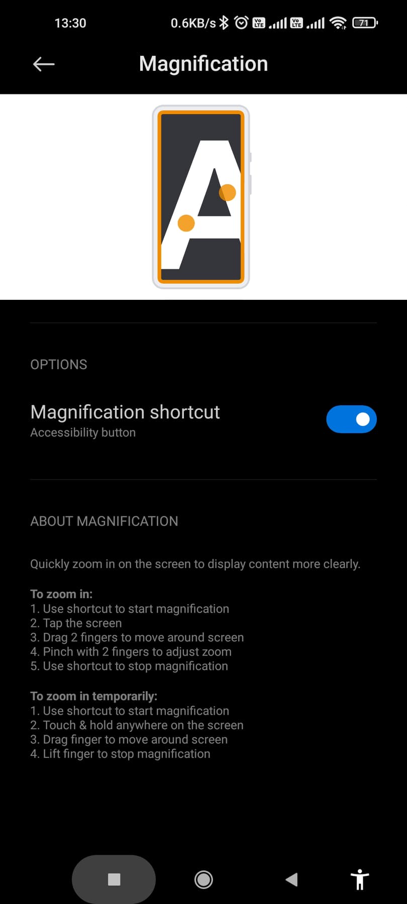 วิธีการใช้โหมด Magnification ก็แสนจะง่ายดาย โดยเมื่อเรากดเปิด Shortcut แล้ว UI ของมือถือแต่ละรุ่นจะบอกวิธีเข้าโหมด Magnification ให้ว่าต้องทำยังไงบ้าง โดยบางรุ่นอาจมีปุ่มเพิ่มมาให้ตรงแถบ Navigation bar, ให้กดปุ่มปรับเสียง +- พร้อมกัน หรืออาจจะใช้วิธีลากนิ้วเป็น Gesture เพื่อเรียกใช้ก็ได้