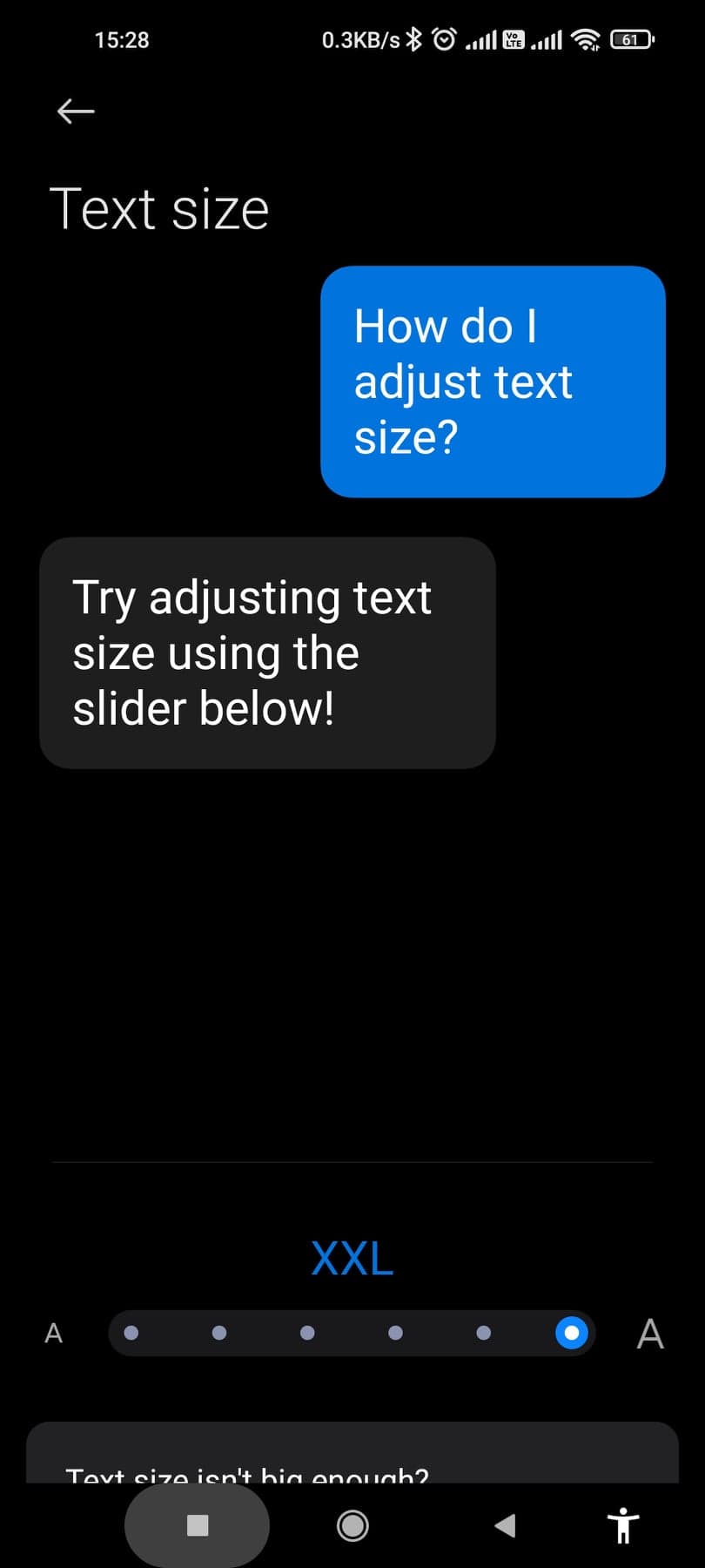 แต่การแสดงผลตัวอักษรใหญ่ ๆ แบบนี้ อาจจะทำให้การเรียงบรรทัดของเมนูหรือชื่อแอปต่าง ๆ ถูกตัดแบบแปลก ๆ เพราะ UI ถูกออกแบบมาให้ใช้กับตัวอักษรขนาดปกตินั่นเองครับ