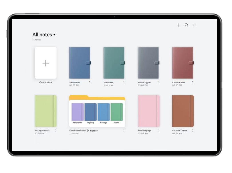 สร้างอัลบั้มไฟล์ต่างๆด้วยดีไซน์สวยไม่เหมือนใคร ใน HUAWEI Notes ผู้ใช้งานสามารถดีไซน์หน้าปกสมุดโน้ตได้ตามแบบที่ต้องการ สามารถจัดประเภทโน้ตสร้างเป็นโฟลเดอร์เพิ่มความเป็นระเบียบในการจัดเรียงข้อมูล อีกทั้งยังสามารถปักหมุดโฟลเดอร์ที่สำคัญไว้ที่ด้านบนสุดเพื่อความสะดวกและง่ายก็ต่อการใช้งาน รวมทั้งเพิ่มความรวดเร็วในการค้นหาโน้ตโดยพิมพ์คีย์เวิร์ดคำที่ต้องการในช่องค้นหา ระบบจะทำการค้นหาโน้ตที่ตรงกับคีย์เวิร์ดที่ต้องการให้ทันที