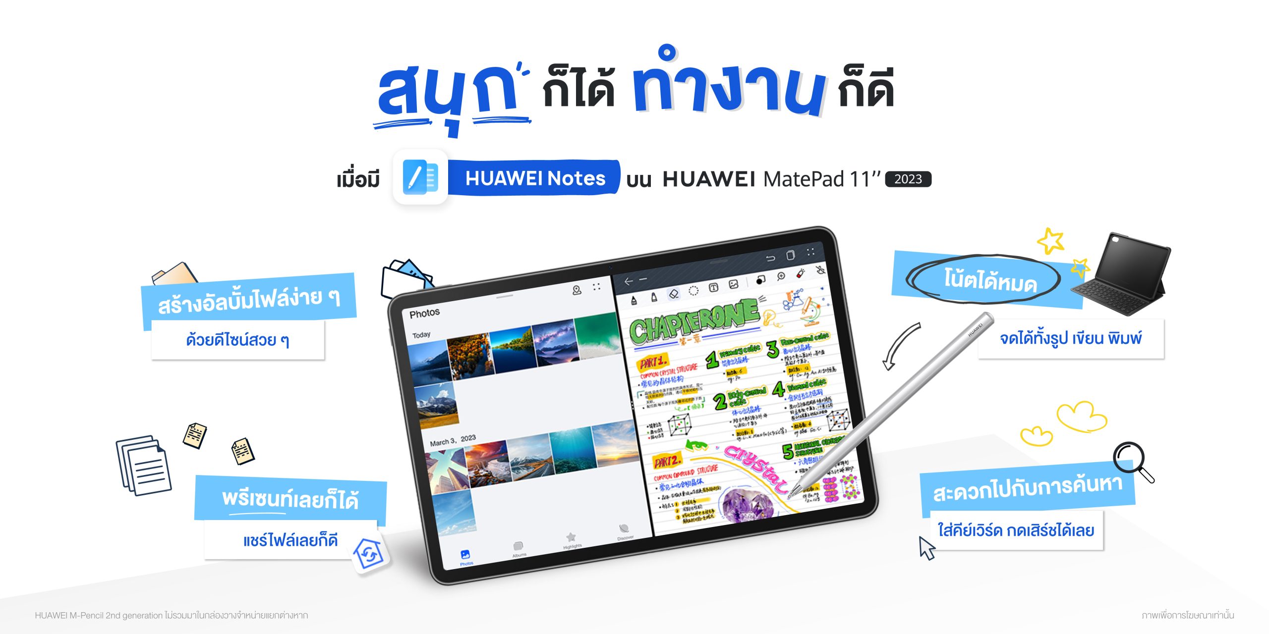 โน้ตได้หมด จดได้ทั้งรูป เขียน พิมพ์ทำงานร่วมกับปากกา HUAWEI M-Pencil 2 generation ในการเขียนข้อความ ตัดภาพเฉพาะส่วนด้วยฟีเจอร์ Take Snippet และออกแบบเลคเชอร์เลือกการไดคัทภาพแล้วสามารถใช้ปากกาเคลื่อนยายภาพประกอบกันได้อย่าง เพิ่มสีสันของโน้ตได้อย่างไร้ขีดจำกัดด้วยความสามารถในการดูดสีได้จากทั้งภาพถ่ายจริงและดูดสีข้ามแอปพลิเคชันได้ด้วยฟีเจอร์ Cross-app Colour เพิ่มความสะดวกระหว่างการขีด เขียน เมื่อเราเขียนผิดวาดผิด ไม่ต้องเข้าฟังก์ชันอื่นๆ เปลี่ยนเป็นยางลบ แค่กดค้างไว้ที่หน้าจอก็สามารถ เปลี่ยนปากกาเป็นยางลบแล้วลบสิ่งที่ต้องการได้