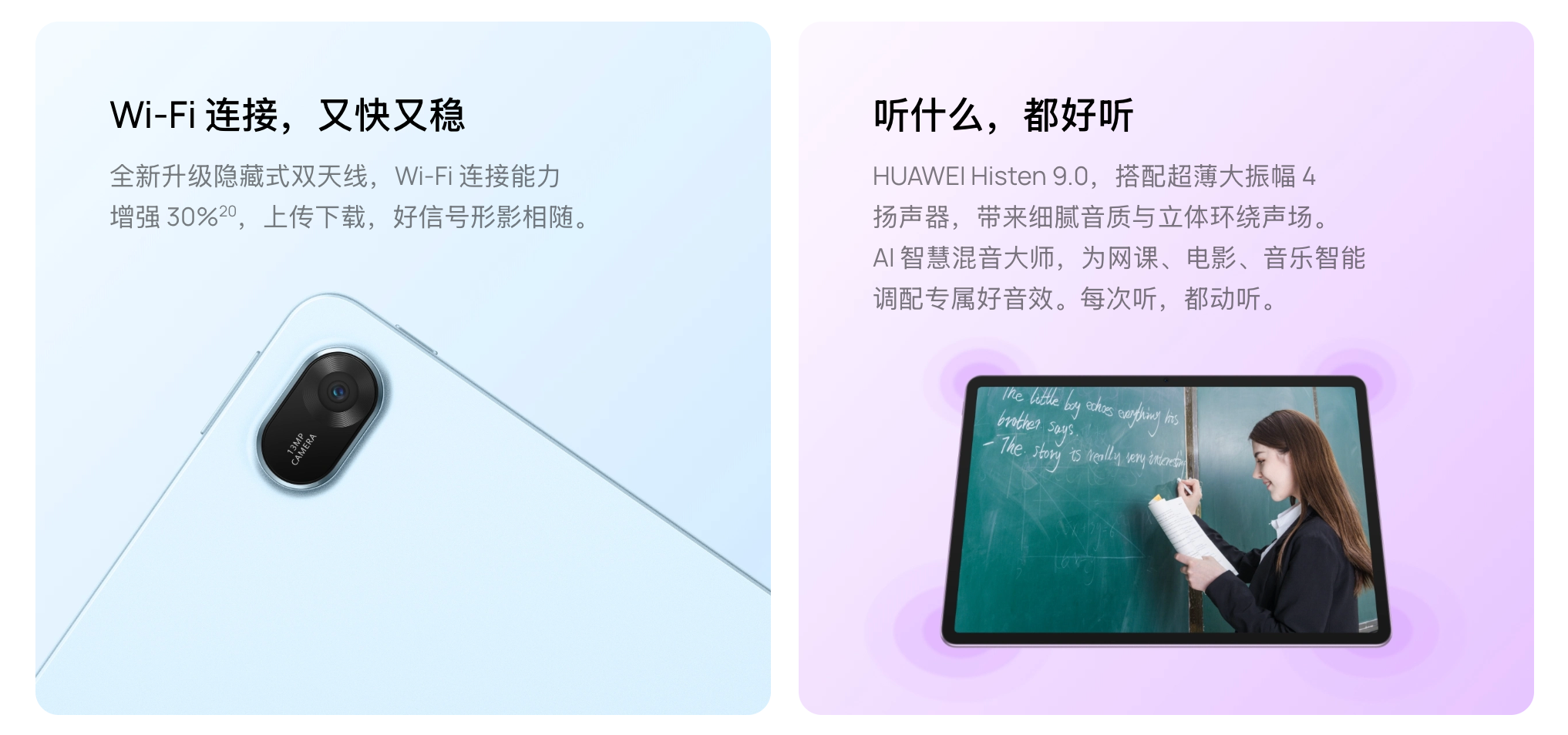 กล้องหลังความละเอียด 13MP (f/1.8) กับกล้องหน้า 8MP (f/2.0) ลำโพงระบบสเตอริโอ 4 ตัว (HUAWEI Histen 9.0) รองรับการเชื่อมต่อ Wi-Fi 6 บลูทูธเวอร์ชัน 5.2 และพอร์ตเชื่อมต่อ USB-C 2.0