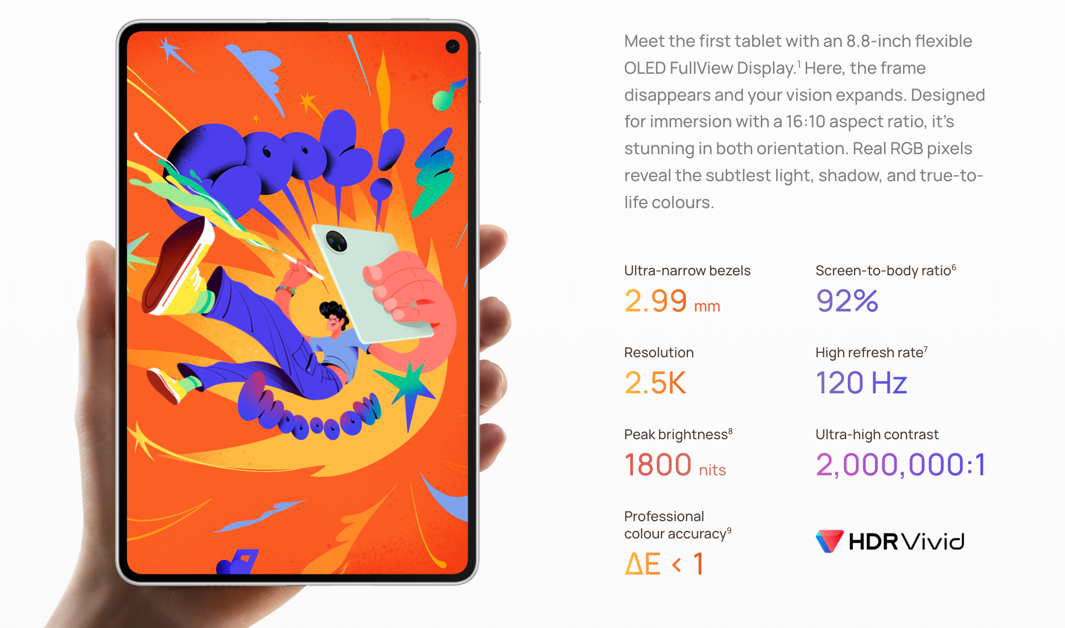 จุดเด่นที่ทำให้ MatePad Mini เป็นแท็บเล็ตที่ใคร ๆ ก็อยากให้วางขาย Global ก็คือขนาดหน้าจอ 8.8 นิ้ว Flexible OLED PaperMatte Display ลดแสงสะท้อน ขอบจอบางเป็นพิเศษ 2.99 มม. ในอัตราส่วนแบบ 16:10 รีเฟรชเรต 120Hz ความละเอียด 2.5K และความสว่างหน้าจอสูง 1,800 นิต