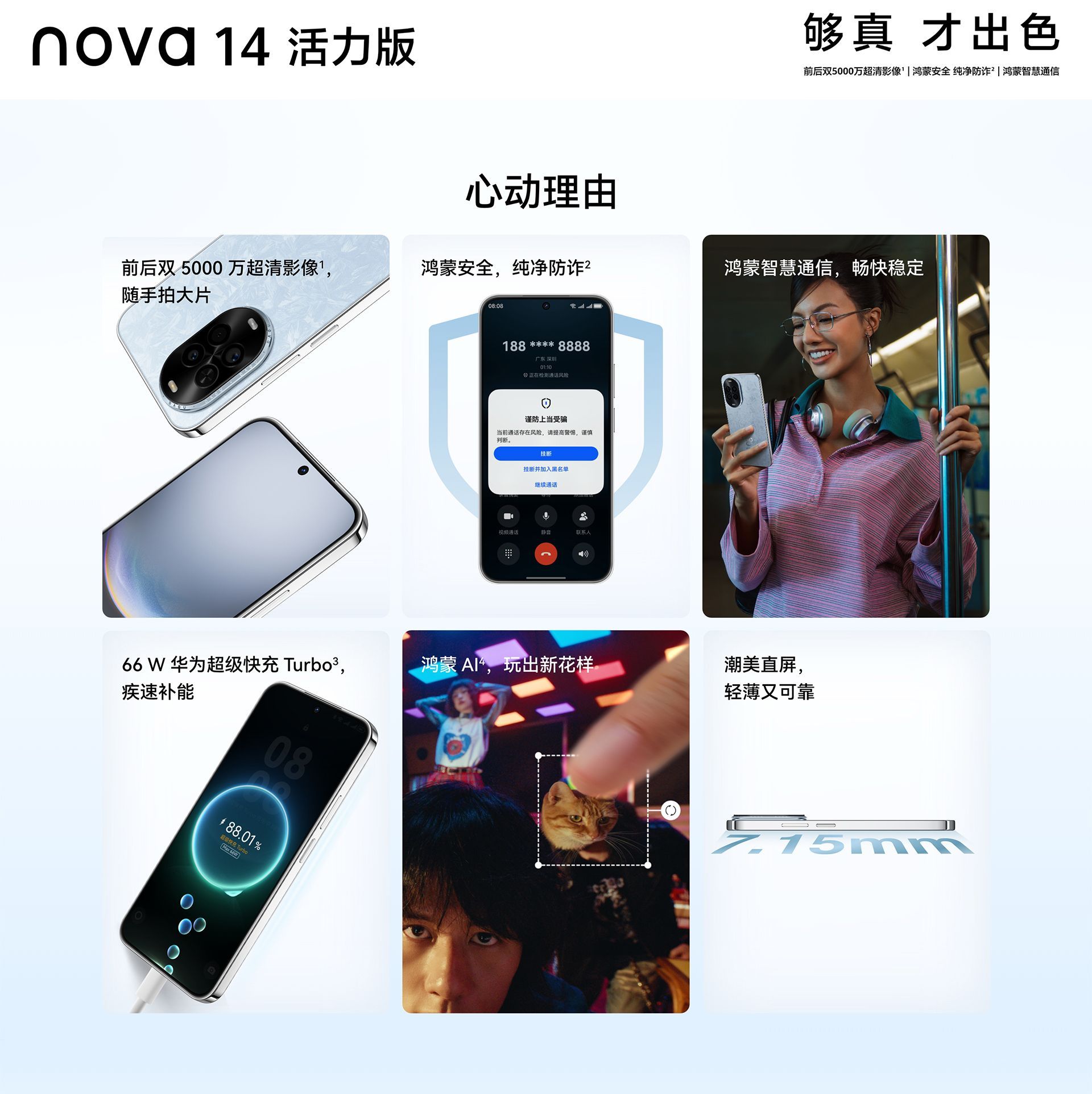 HUAWEI nova 14 Lite เลือกใช้หน้าจอแบบ OLED ขนาด 6.7 นิ้ว ความละเอียด FULL HD+ รองรับอัตรารีเฟรชหน้าจอ 120Hz พร้อมกับกล้องเซลฟี่ความละเอียด 50 ล้านพิกเซล และแบตเตอรี่ความจุ 5,500mAh รองรับความเร็วการชาร์จด้วยสายอยู่ที่ 66W จากเดิมที่รุ่น nova 14 จะชาร์จเร็ว 100W