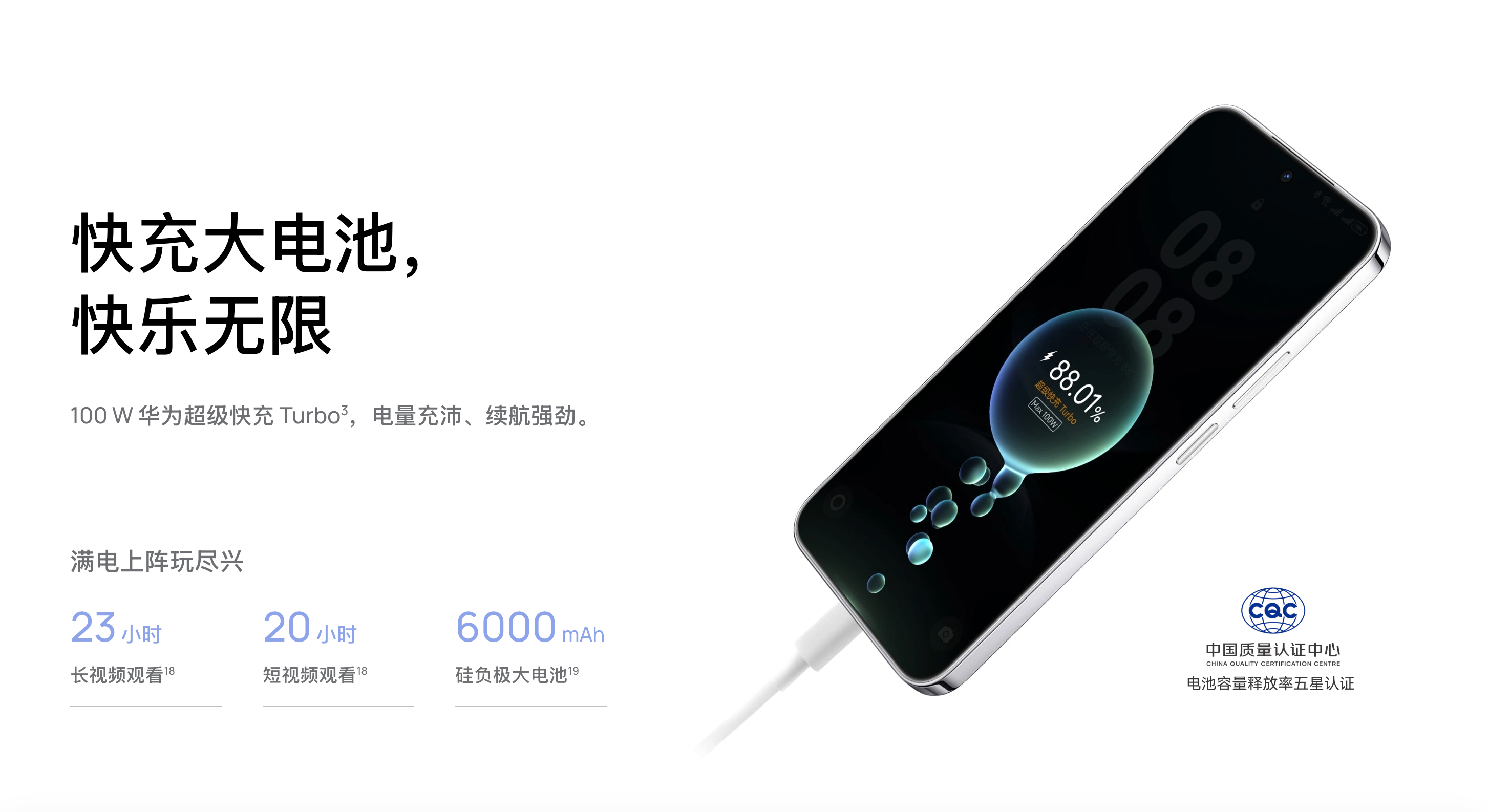 ความจุแบตเตอรี่ได้มาที่ 6,000mAh ชาร์จไว 100W เทียบเท่ากับรุ่นพี่ แต่จะไม่รองรับชาร์จไร้สายเหมือนรุ่น Ultra ทำงานอยู่บนระบบปฏิบัติการ HarmonyOS 6.0 มาตรฐานการทนน้ำทนฝุ่น IP65