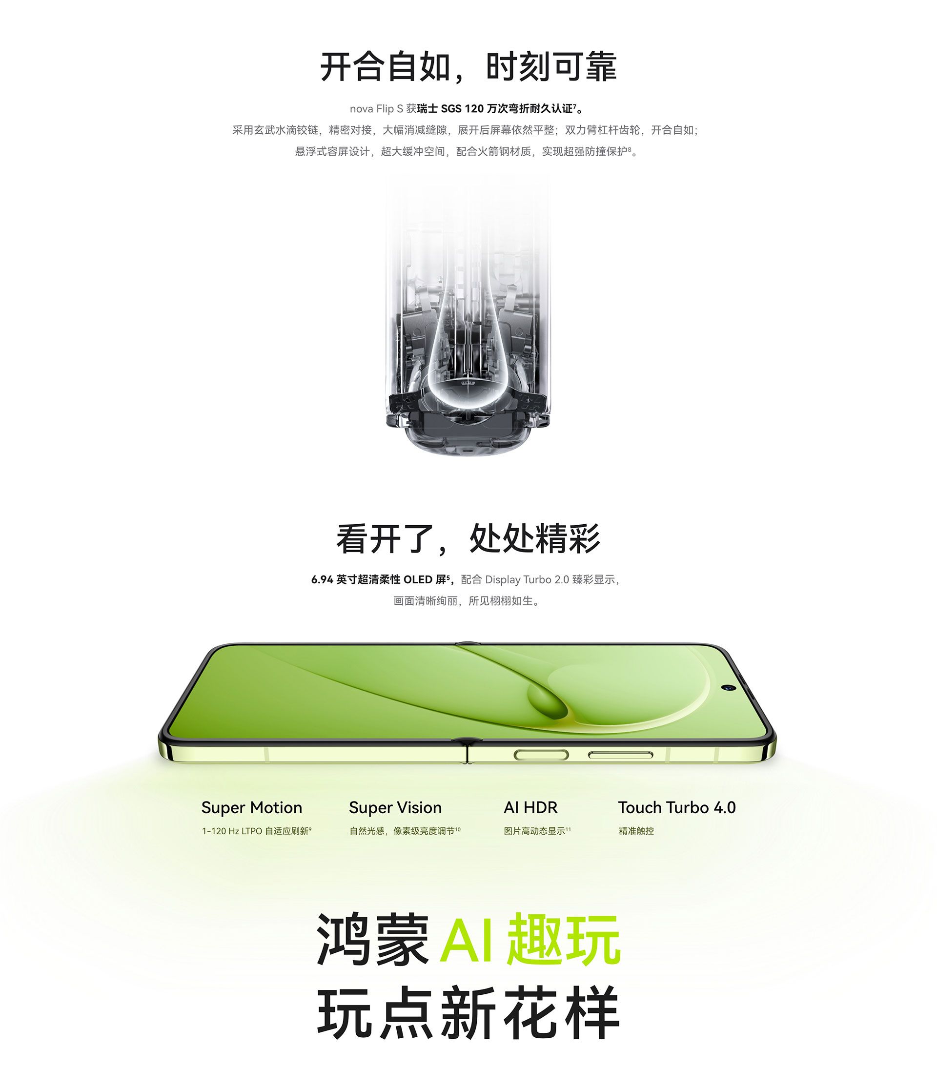 หน้าจอแสดงผลของ HUAWEI nova Flip S เลือกใช้เป็นเทคโนโลยีหน้าจอแบบ OLED รองรับเทคโนโลยี SuperMotion อัตรารีเฟรชเรท 120Hz เหมือนกันทั้งจอด้านนอก และจอด้านใน แสดงผลภาพที่คมชัดและสีสันที่สดใสดูเป็นธรรมชาติ โดยหน้าจอหลัก และจอแสดงผลด้านนอกมีขนาดอยู่ที่ 6.94 นิ้ว และ 2.14 นิ้ว ตามลำดับ