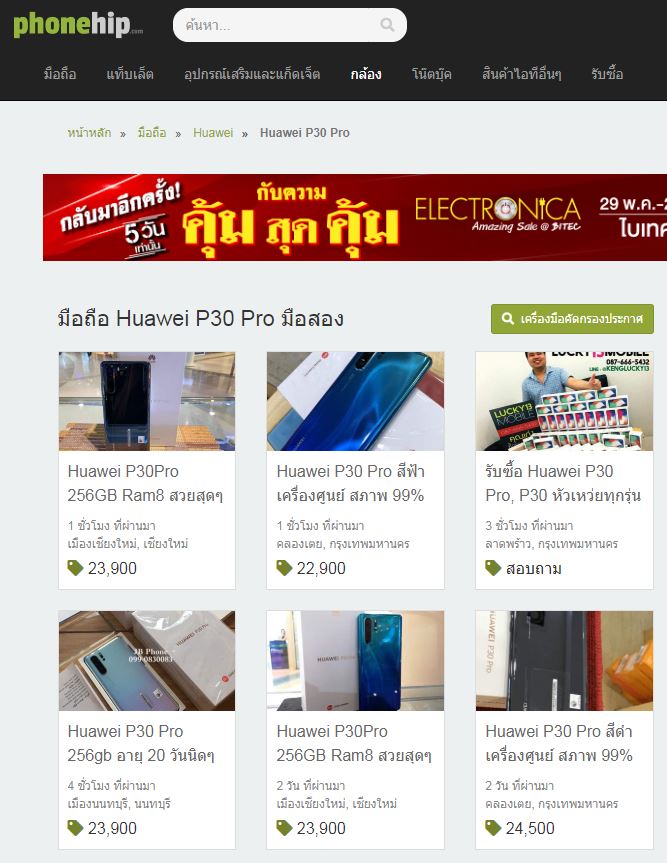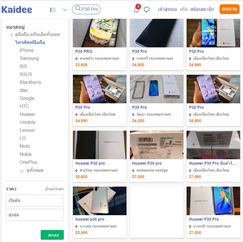 ส่วนเว็บไซต์ kaidee มีราคา Huawei P30 Pro มือสองที่ค่อนข้างดีเช่นกัน โดยราคาต่ำสุดก็เท่ากันกับเว็บข้างต้นเลยที่ 22,900 บาท