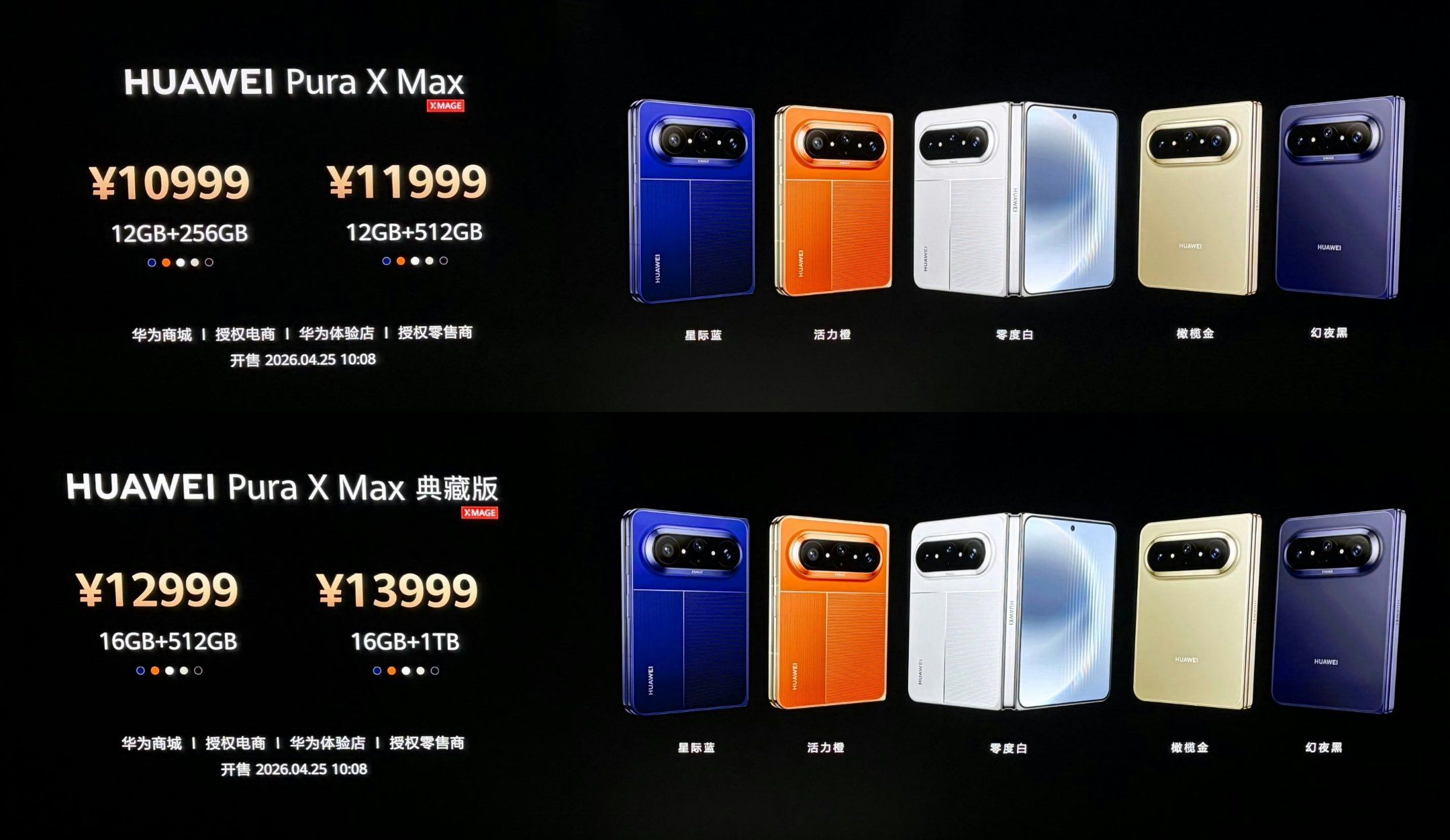 HUAWEI Pura X Max เปิดตัวในประเทศจีนด้วยกันทั้งหมด 5 สี ได้แก่ สีน้ำเงิน (Interstellar Blue), สีส้ม (Dynamic Orange), สีขาว (Cold White), สีทอง (Olive Gold) และสีดำ (Phantom Black)