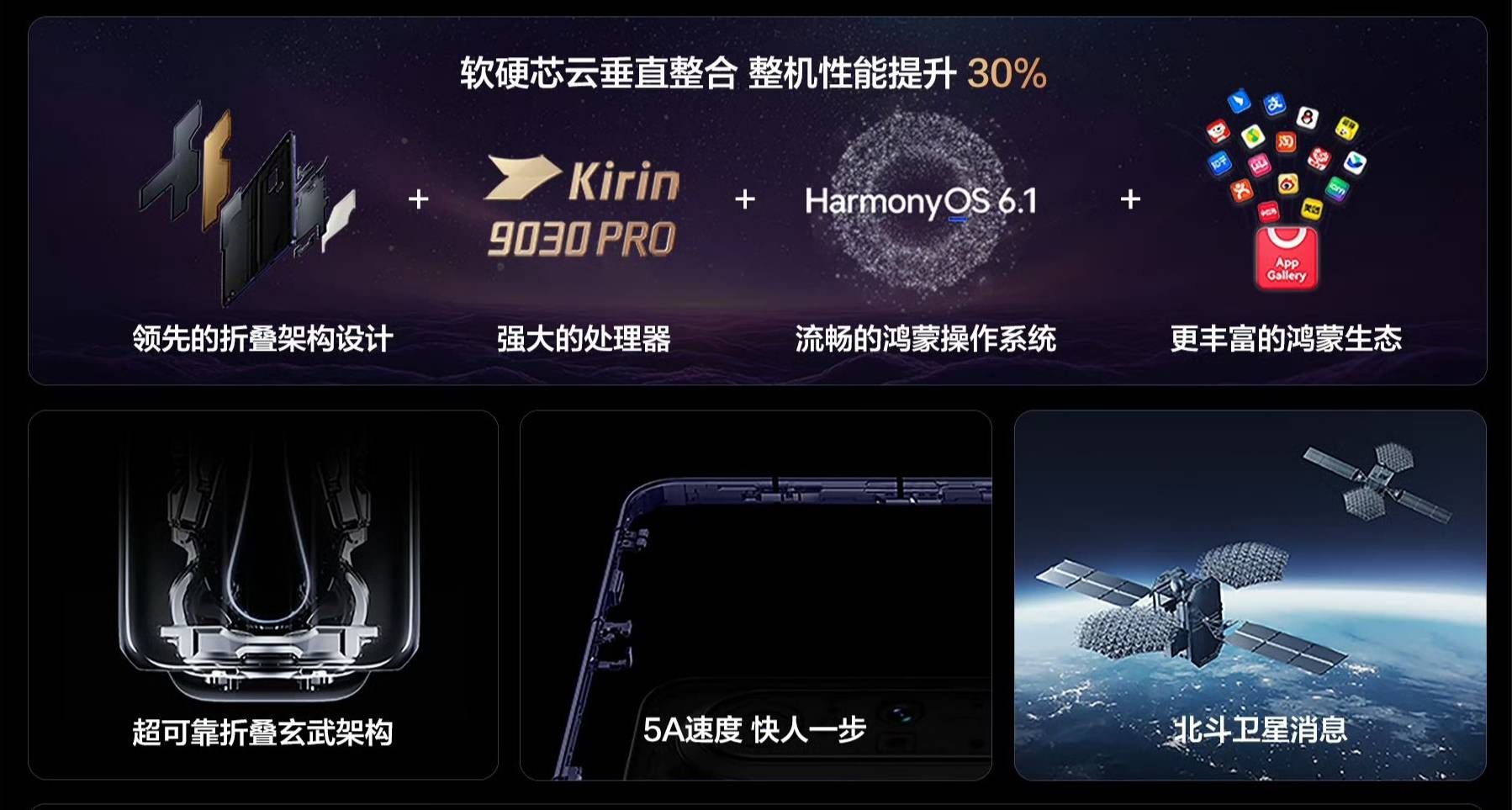 ชิปประมวลผลเลือกใช้เป็น Kirin 9030 Pro และระบบปฏิบัติการ HarmonyOS 6.1 ส่งผลให้ประสิทธิภาพการทำงานลื่นไหลกว่าเดิม 30% ตัวเครื่องทนน้ำทนฝุ่น IP59 & IP58 กระจกหน้าจอด้านนอกคือ Kunlun Glass รุ่นที่ 2