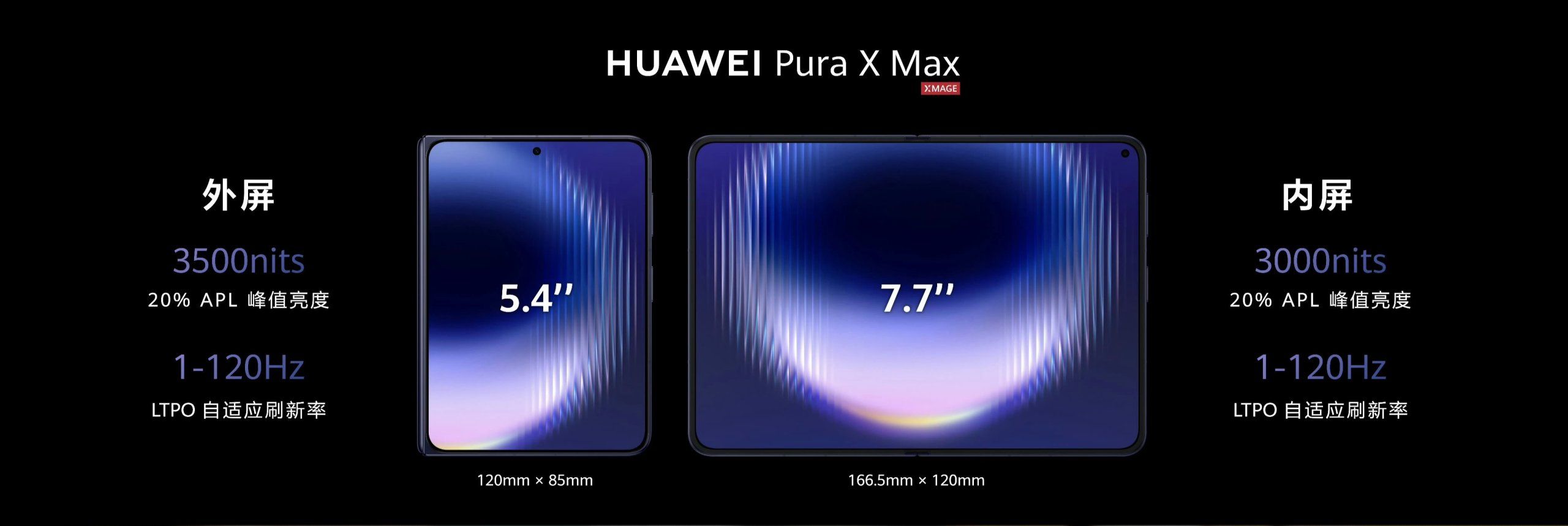 หน้าจอ OLED ของ HUAWEI Pura X Max มีขนาดอยู่ที่ 7.7 นิ้ว ความสว่าง 3,000 นิต (1-120Hz) และจอแสดงผลภายนอก 5.4 นิ้ว ความสว่าง 3,500 นิต (1-120Hz) ตัวเครื่องบางเพียง 5.2 มม. (เมื่อกางหน้าจอ) น้ำหนักเพิ่มขึ้นเล็กน้อยเป็น 229 กรัม