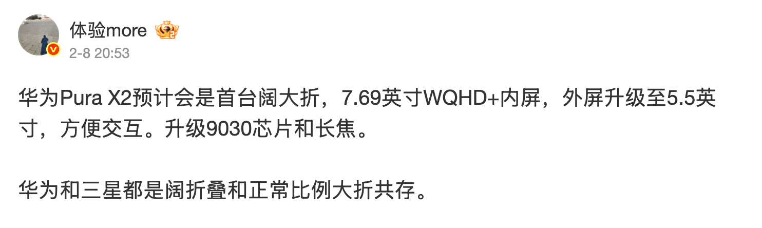 ข้อมูลของ HUAWEI Pura X2 จากฝั่งจีนระบุว่า หน้าจอแสดงผลขนาดใหญ่กว่าเดิมเป็น 7.69 นิ้ว (จากเดิม 6.3 นิ้ว) และหน้าจอด้านนอก 5.5 นิ้ว (จากเดิม 3.5 นิ้ว) มีกำหนดเปิดตัวเดือนมีนาคมนี้