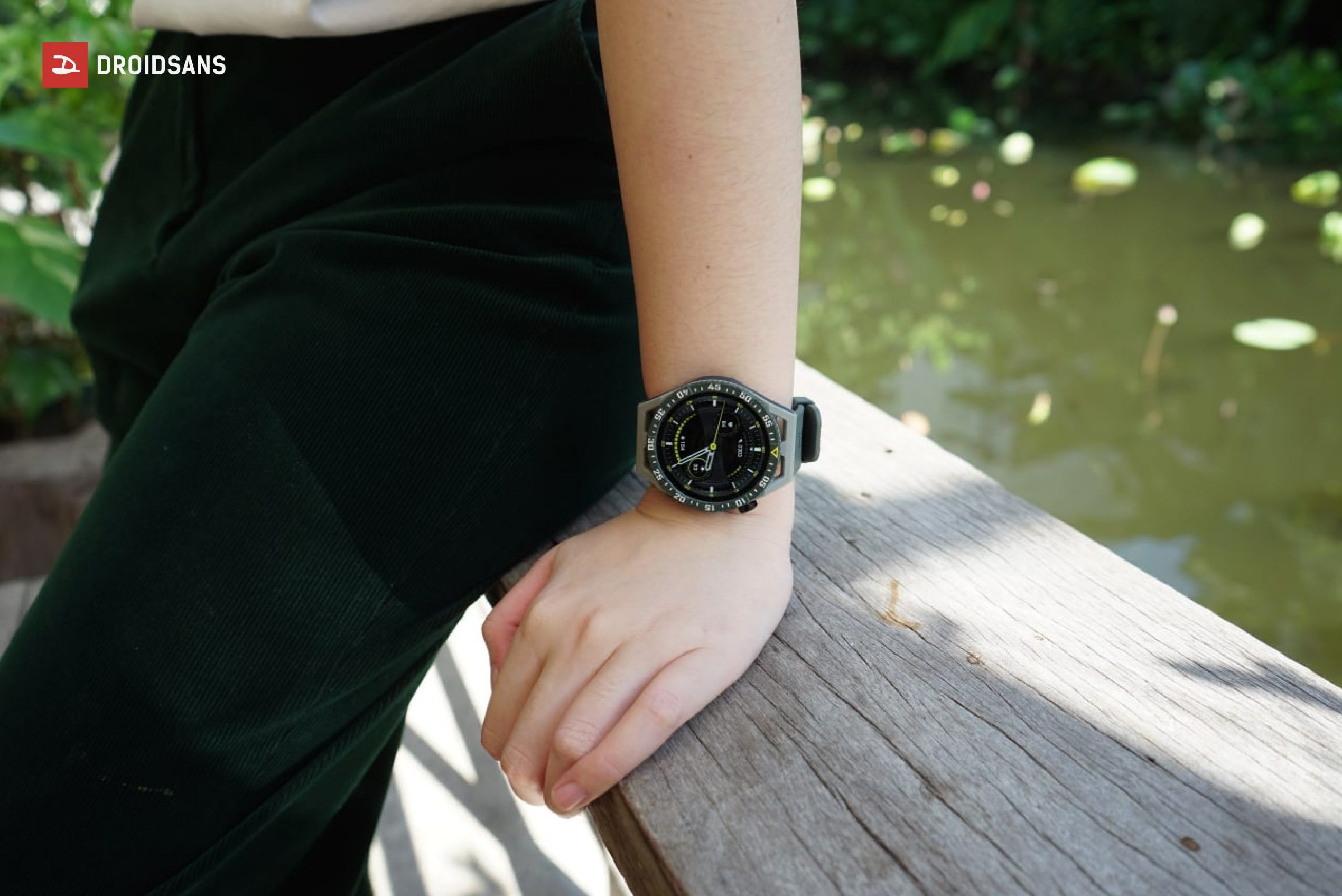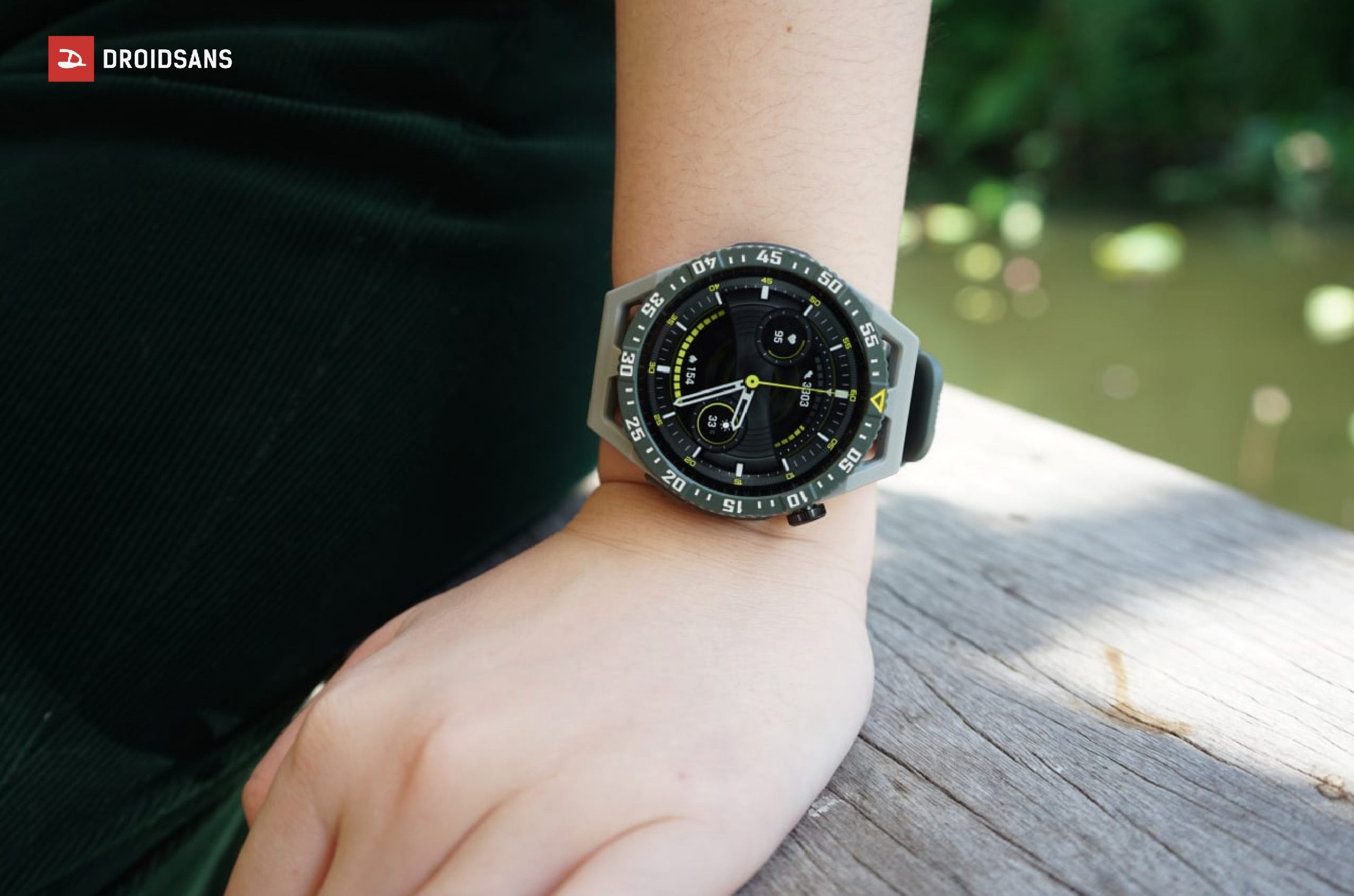 HUAWEI Watch GT 3 SE ที่เราหยิบรีวิวตอนนี้เป็นรุ่นที่ใช้วัสดุ Durable Polmer Fiber มีหน้าปัดขนาด 46.4 มม. ที่มีสายคาดเป็น TPU สีเขียว Wilderness Green