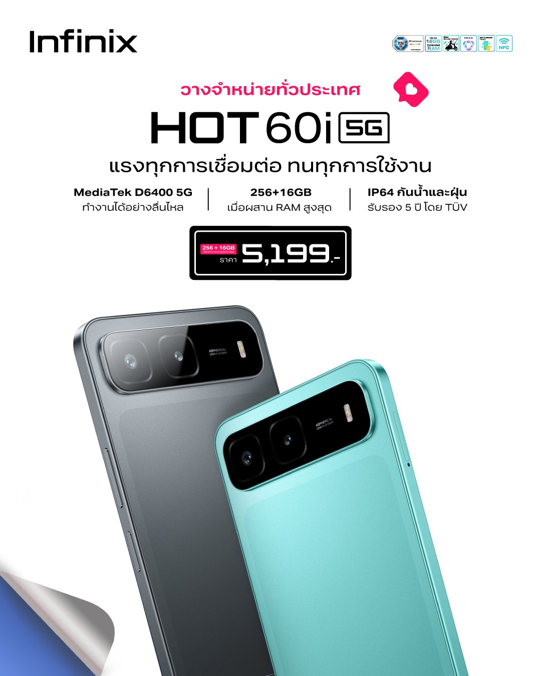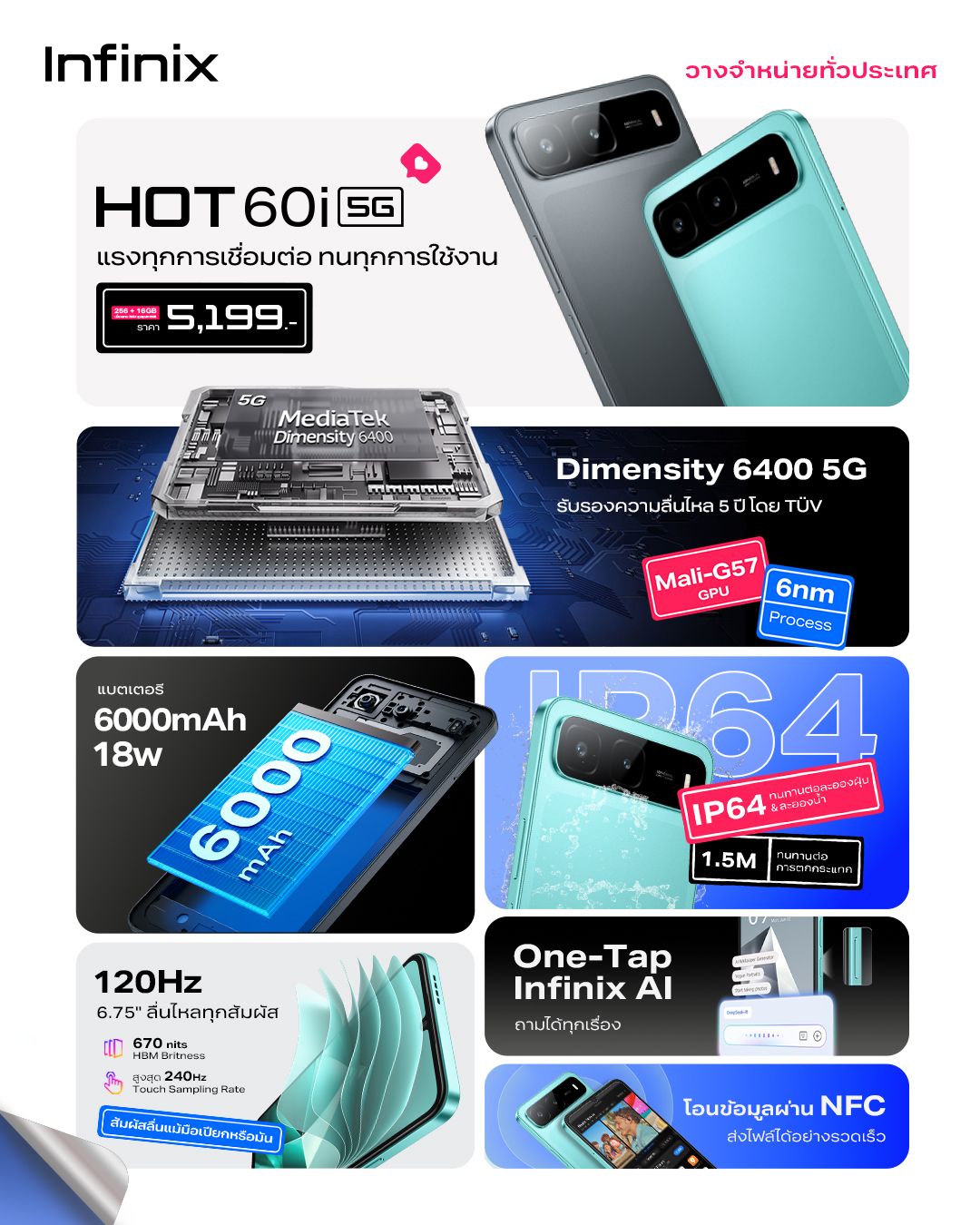 Infinix เปิดวางจำหน่าย Infinix Hot 60i 5G ในราคา 5,199 บาท ชิปเซ็ต MediaTek Dimensity 6400 5G แบตเตอรี่ความจุ 6,000mAh และหน้าจอขนาด 6.75 นิ้ว รีเฟรชเรต 120Hz รองรับการใช้งานที่ลื่นไหล และมาตรฐานความทนทาน IP64 จับคู่กับดีไซน์ฝาหลังสุดพรีเมียม
