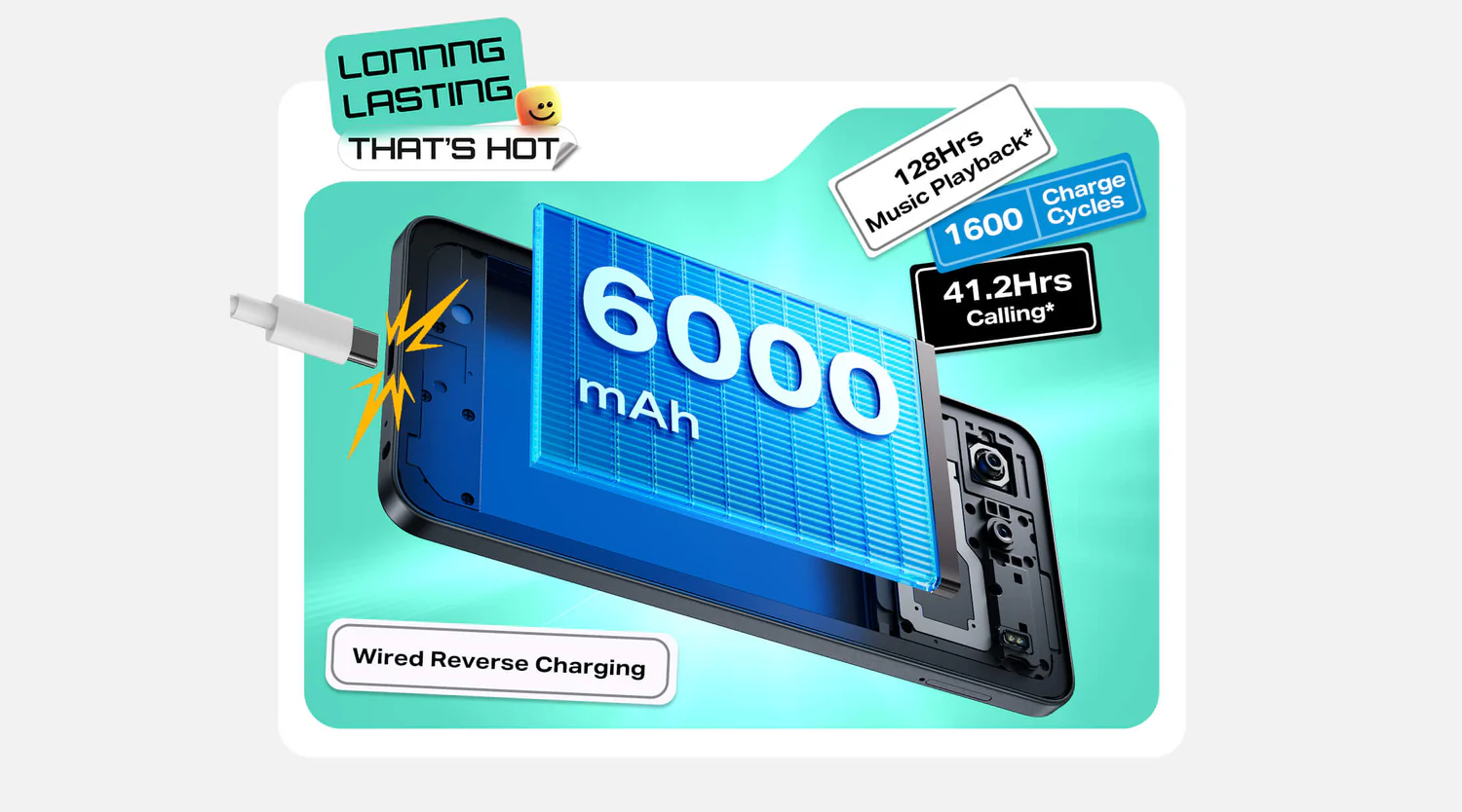 ความจุแบตเตอรี่ 6,000mAh สามารถใช้งานเพื่อโทรสนทนาได้นานสุด 41.2 ชั่วโมง รองรับการชาร์จผ่านสายที่ความเร็ว 18W รองรับการชาร์จแบบย้อนกลับ (Wired Reverse Charging) รองรับมาตรฐานการทนน้ำทนฝุ่น IP64 หน่วยความจำ 8GB และพื้นที่จัดเก็บข้อมูล 256GB