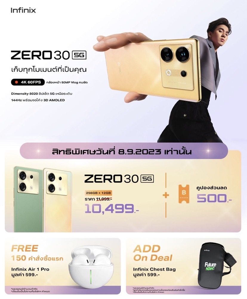 เปิดราคามาอย่างดุเดือดสำหรับ Infinix Zero 30 5G มือถือรุ่นเรือธงของแบรนด์ในปี 2023 มาพร้อมสเปคจัดเต็ม ได้ทั้งชิปแรง Dimensity 8020 ความจุเยอะ 12GB + 256GB ในดีไซน์จอโค้ง มาพร้อมกล้องหลัง 108MP + กันสั่น OIS และกล้องเซลฟี่ 50MP ที่สามารถถ่ายวิดีโอ 4K@60FPS ได้ ทั้งหมดนี้มาในราคาแค่ 11,999 บาทเท่านั้น