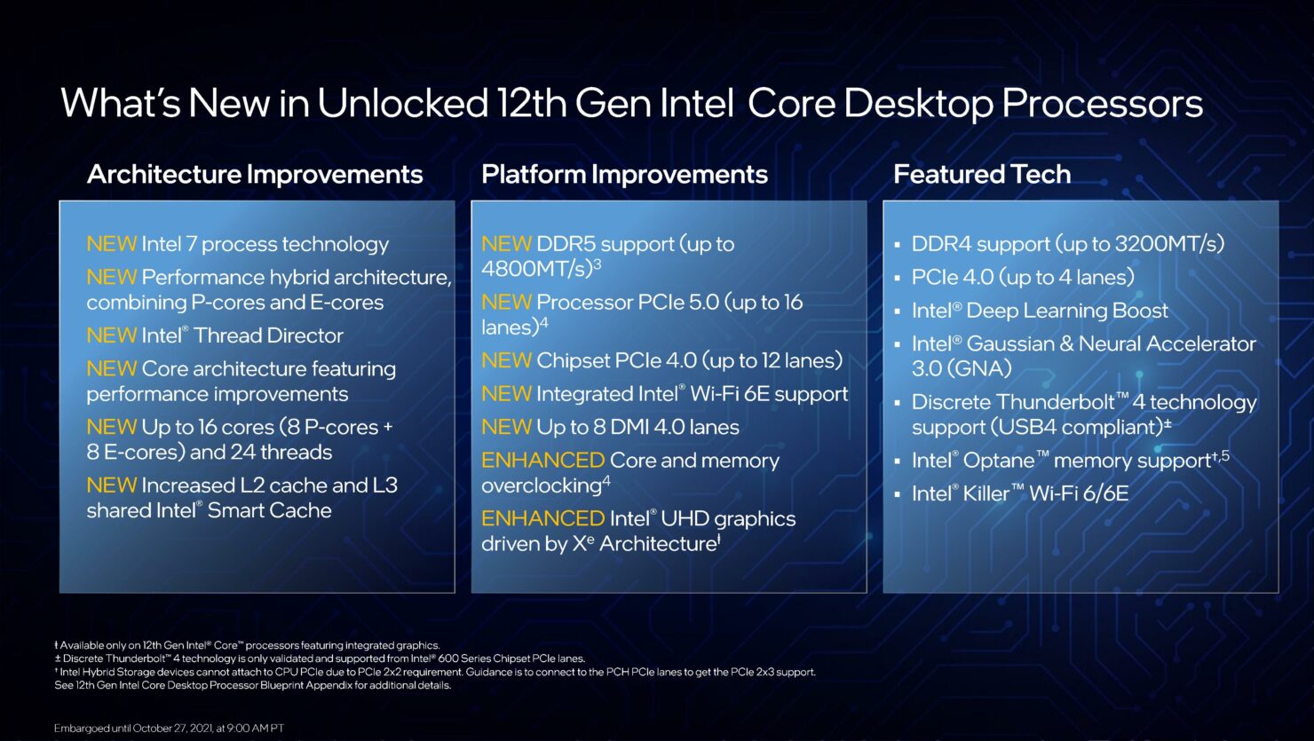 สถาปัตยกรรม Alder Lake-S รอบนี้ Intel ใช้กระบวนการผลิตแบบ Intel 7 (sub-10nm) และเปลี่ยนจากรูปแบบ core/thread เดิม หันมาใช้เป็น core แบบไฮบริด คือมี performance core (p-core) ที่เป็น core ใหญ่ประสิทธิภาพแรง มีค่า clock speed สูง และ efficient-core (e-core) ที่เน้นประหยัดพลังงานสำหรับการทำงานทั่วไป สเปคการทำงานต่าง ๆ มีการปรับปรุงเพิ่มขึ้นดังนี้