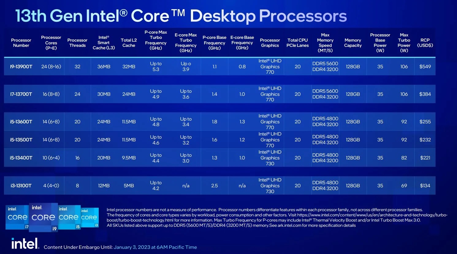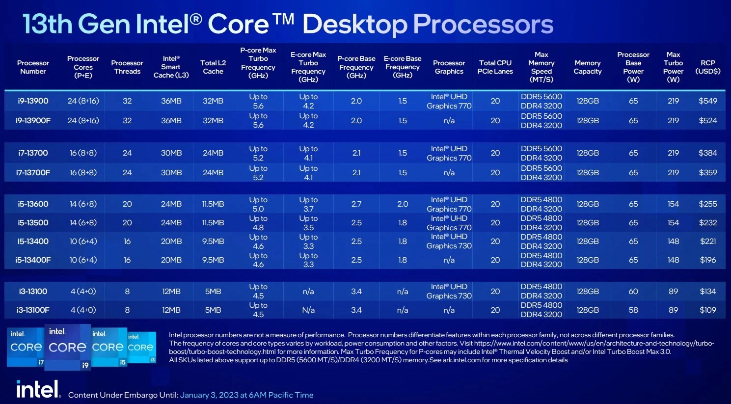รุ่นท็อปสุดของซีพียูกลุ่มนี้คือ Core i9-13900 / 13900F สเปคคอร์เธรดคือ 24 Core (8P+16E) / 32 Thread เท่ากับรหัส K โดยเพิ่มขึ้นจาก 16C/24T บนเจนก่อน ดันค่า Clock ได้สูงสุด 5.6 GHz ทาง Intel เคลมประสิทธิภาพโดยรวมว่ามี Single-Thread และ Multi-Thread เพิ่มขึ้นจาก 12th Gen อยู่ที่ 11% และ 32% ตามลำดับ พร้อมระบุว่าใช้กับบอร์ดเดิม Socket LGA 1700 ได้