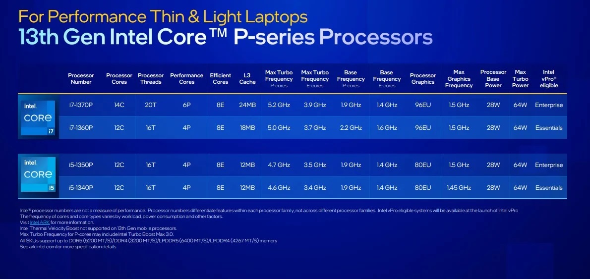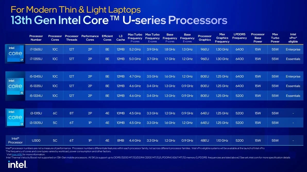 ส่วนซีรีส์โน้ตบุ๊ครองลงมาอื่น ๆ ได้แก่รหัส H ความแรงลดหลั่นจาก HX สเปคยังคงเน้นเล่นเกม มีคอร์เธรดสูงสุด 14C/20T ใช้ไฟ 45W (ตัวท็อปคือ i9-13900HK) ถัดมารหัส P ใช้บนโน้ตบุ๊คทำงานที่ยังเน้นความแรง คอร์เธรดพอ ๆ กับรุ่น H ใช้ไฟ 28W (ตัวท็อป i7-1270P) ตามด้วยรหัส U สำหรับโน้ตบุ๊ครุ่นบางเบาเน้นประหยัดพลังงานสูงสุด ใช้ไฟเพียง 15W (ตัวท็อป i7-1365U) ปิดท้ายด้วยรุ่นพิเศษคือ Intel Processor เปลี่ยนชื่อมาจากน้องเล็ก Pentium / Celeron มีเพียงรุ่นเดียวคือ U300 สเปคเป็น 5C (1P+4E) / 6T